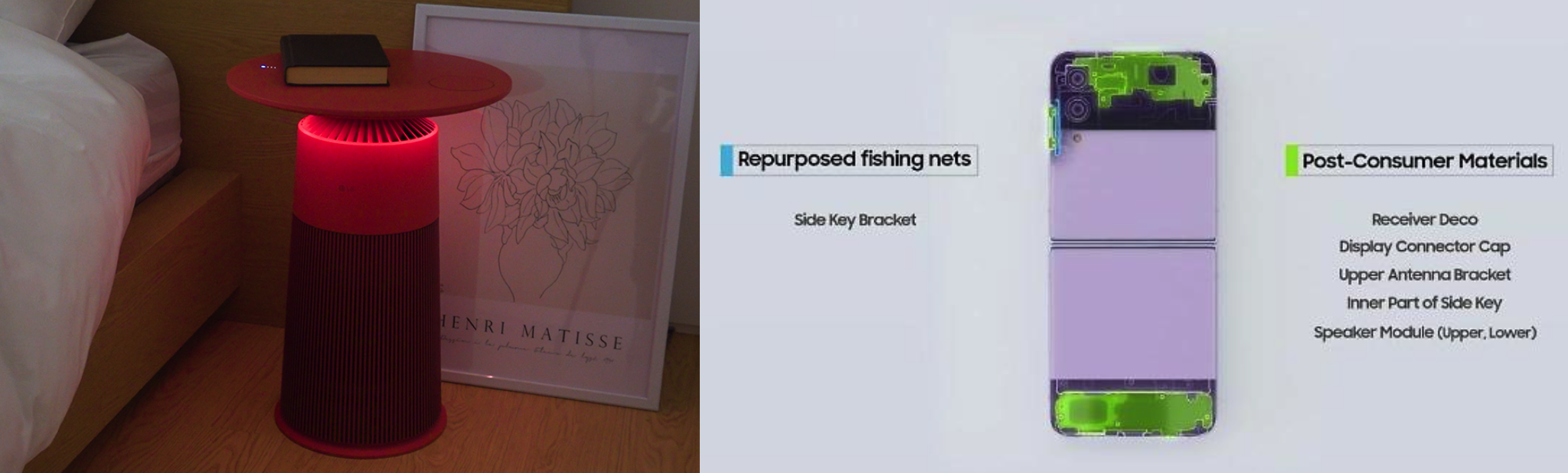 모빌리티와 가전 산업도 이러한 친환경 행보를 보이고 있는 가운데, LG전자는 지난해 폐기물을 재활용해서 만든 테이블형 공기청정기 'LG퓨리케어 에어로퍼니처'를 선보였다. 그리고 삼성전자는 폐어망 재활용 플라스틱 소재를 제품에 적용하여 2022 미국 캘리포니아에 위치한 환경 단체(NGO) SEAL(Sustainability, Environmental Achievement and Leadership)에서 부여하는 비즈니스 지속가능 어워드를 수상하였는데 갤럭시 시리즈를 비롯한 TV, 노트북, 리모콘 등 여러 제품에 폐기물들을 활용한 신제품들을 출시하는 등 환경을 위한 다각도의 노력을 보이고 있다.