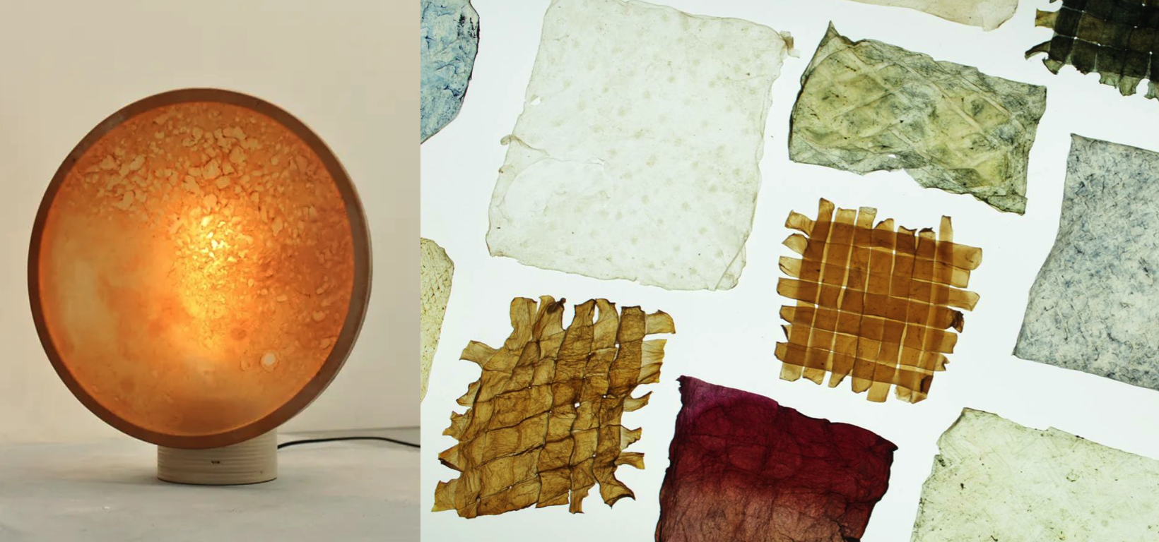 아래 보이는 이미지는 Lionne van Deursen(리오네 반 도르센)이 만든 바이오 소재로, 셀룰로오스 발효 과정에서 생성되는 효모와 박테리아를 사용해 만들어졌다. 이 과정에서 박테리아는 셀룰로오스의 나노 섬유를 회전시키고 표면에 층을 생성하는데, 이 층이 건조되면 가죽과 비슷한 특성을 지닌 단단한 재료가 된다. 살아있는 미생물이 만들어내는 물질로, 생분해성이며 강하고 유연성이 높다는 장점이 있다.