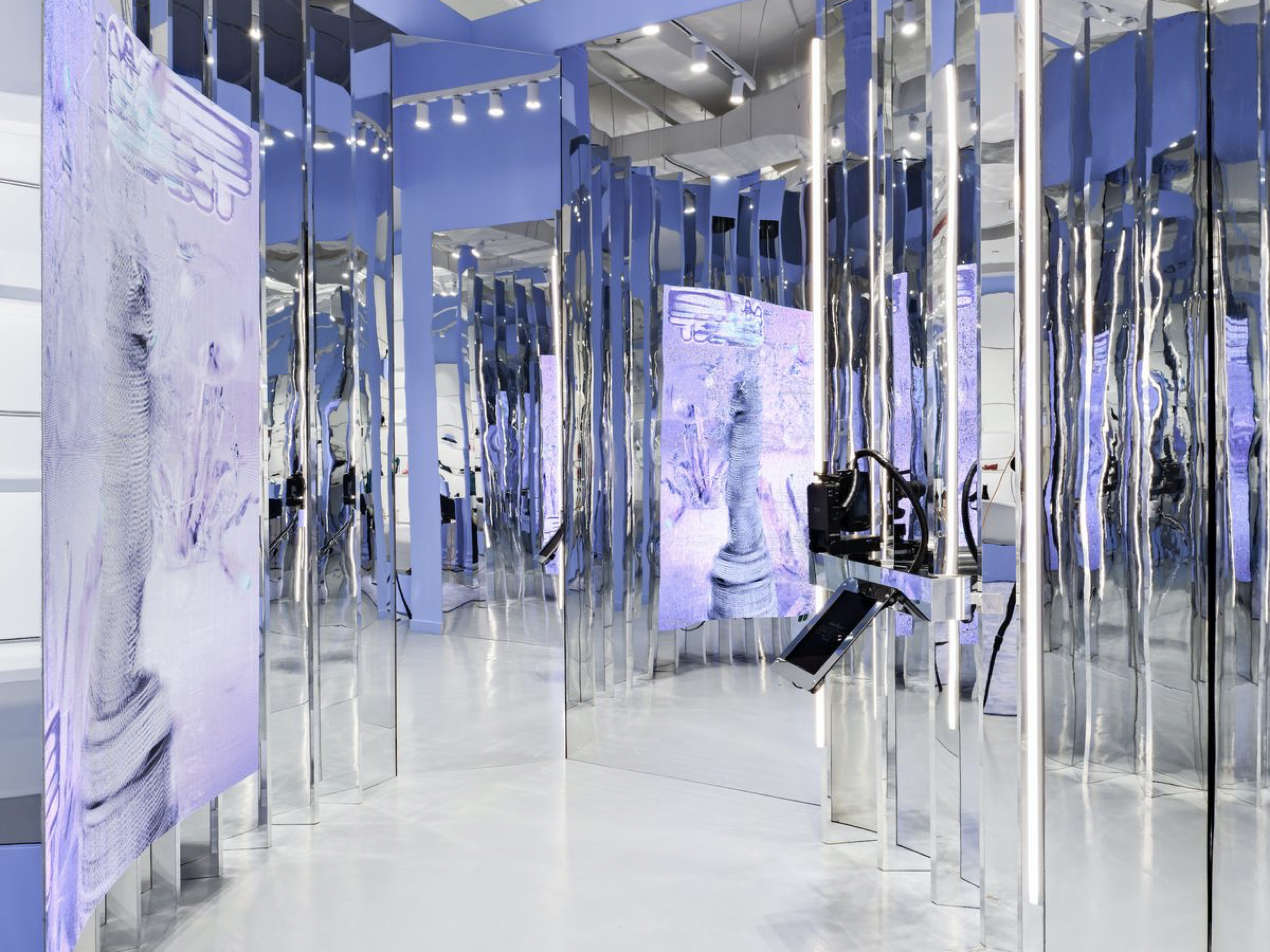 뉴욕의 페라가모 플래그십스토어는 공간 안에서 NFT를 발행하는 색다른 경험을 제공한다. 특히, 굴곡있는 메탈릭한 거울에 쉼없이 펼처지는 디지털 아트와 소프트 비비드 톤으로 온라인과 오프라인의 연결성을 공간 속에 구현했다.