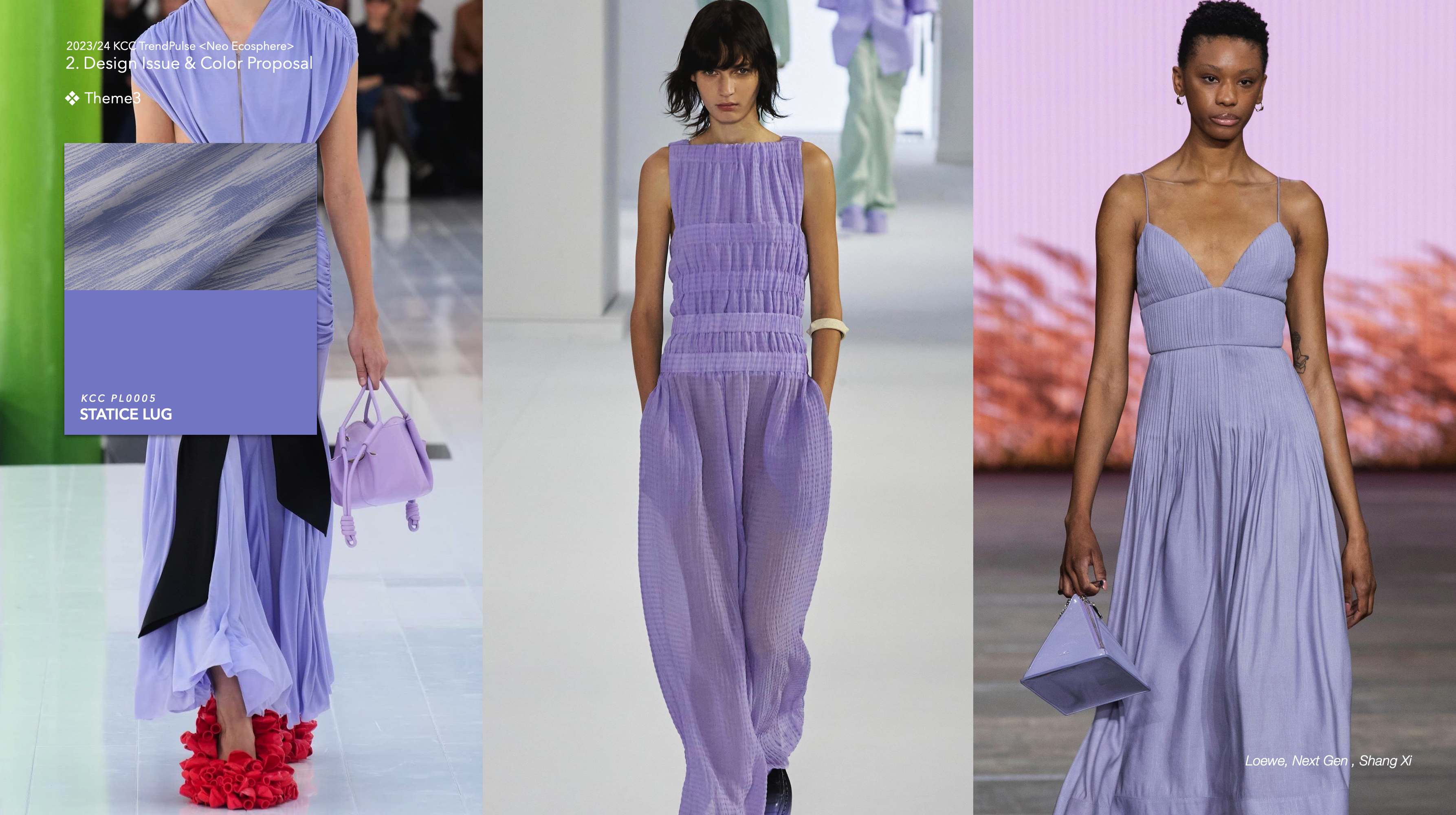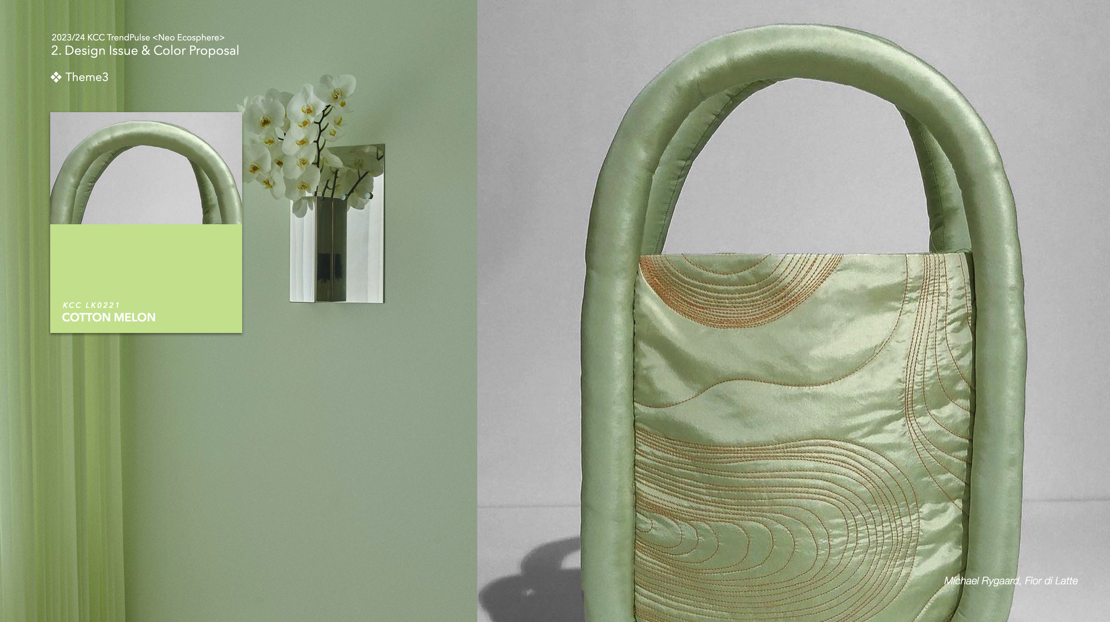 : 글로벌 트렌드 정보기관 WGSN은 향후 2024년도 컬러팔레트에서 파스텔 톤 그린이 중요한 역할을 할 것이라고 언급했다. 스치기만해도 기분 좋은 실크 소재에 적용된 컬러나, 자개에서 보여지는 은은한 광택의 파스텔 그린은 자연스럽고 순수한 에너지를 가진 컬러로 제안된다. 도료로는 부드러운 반광 펄 메탈릭이나 은은한 소프트터치 질감 표현이 가능하다.