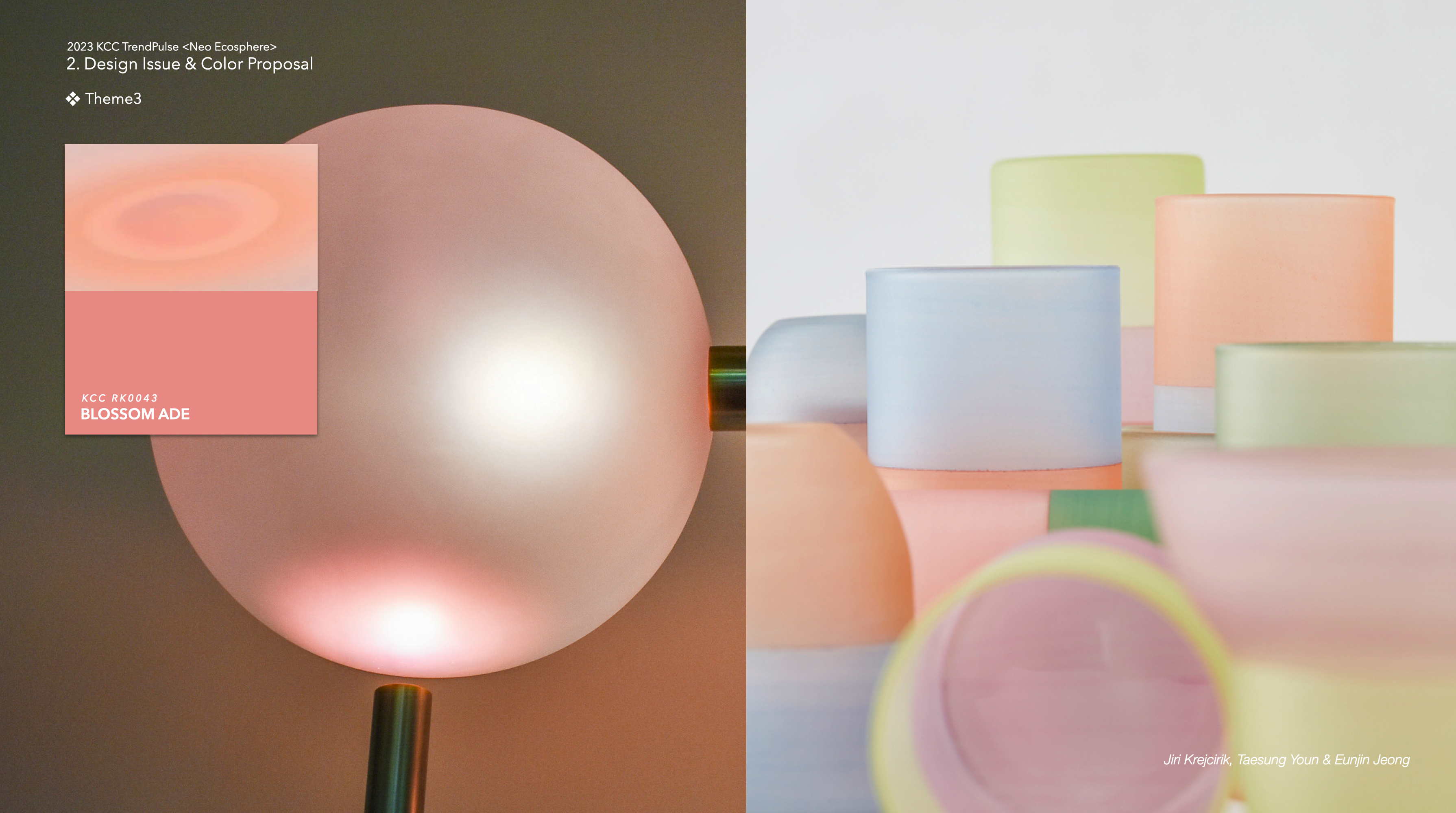 : 어릴 적 찬장에서 보았던 밀크글라스가 현재 재해석되면서, 유년의 향수와 함께 따뜻함을 주는 소재로 주목받고 있다. 광물 표면이나 유약에서 보여지는 부드러운 광은 코코넛 밀크의 소재적 특징이다. 세라믹에서 영감을 받아 고광택 마감으로 표현된 구글의 '네스트 와이파이 프로'는 전자기기 느낌보다는 하나의 오브제로 느껴지는데, 도료 타입으로 표현할 경우 광택있는 세라믹 느낌의 밀크크리어 마감이나 소프트필 도료로 표현할 수 있다.