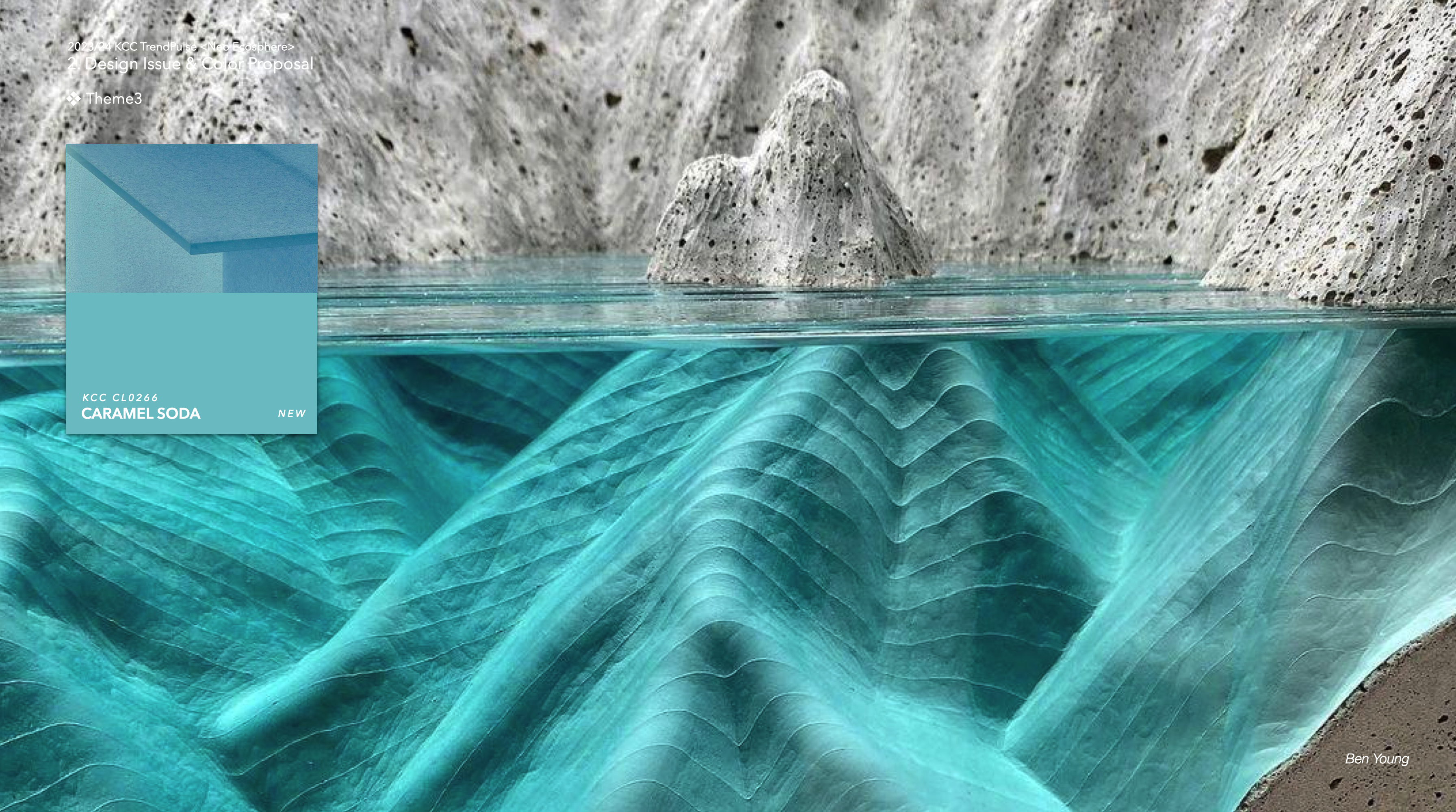 : 캬라멜 소다는 빛이 따뜻하게 스며들어서 맑은 바닷물이 캬라멜화 된 것 같은 질감의 컬러로 제안된다. 유리 또는 실리콘 소재에 적용된 것처럼 매끄럽고 투명감이 있는 컬러로, 빛에 따라 입체감이 느껴지는 3D 광택으로 표현하면 더 매력적으로 활용이 가능하다.