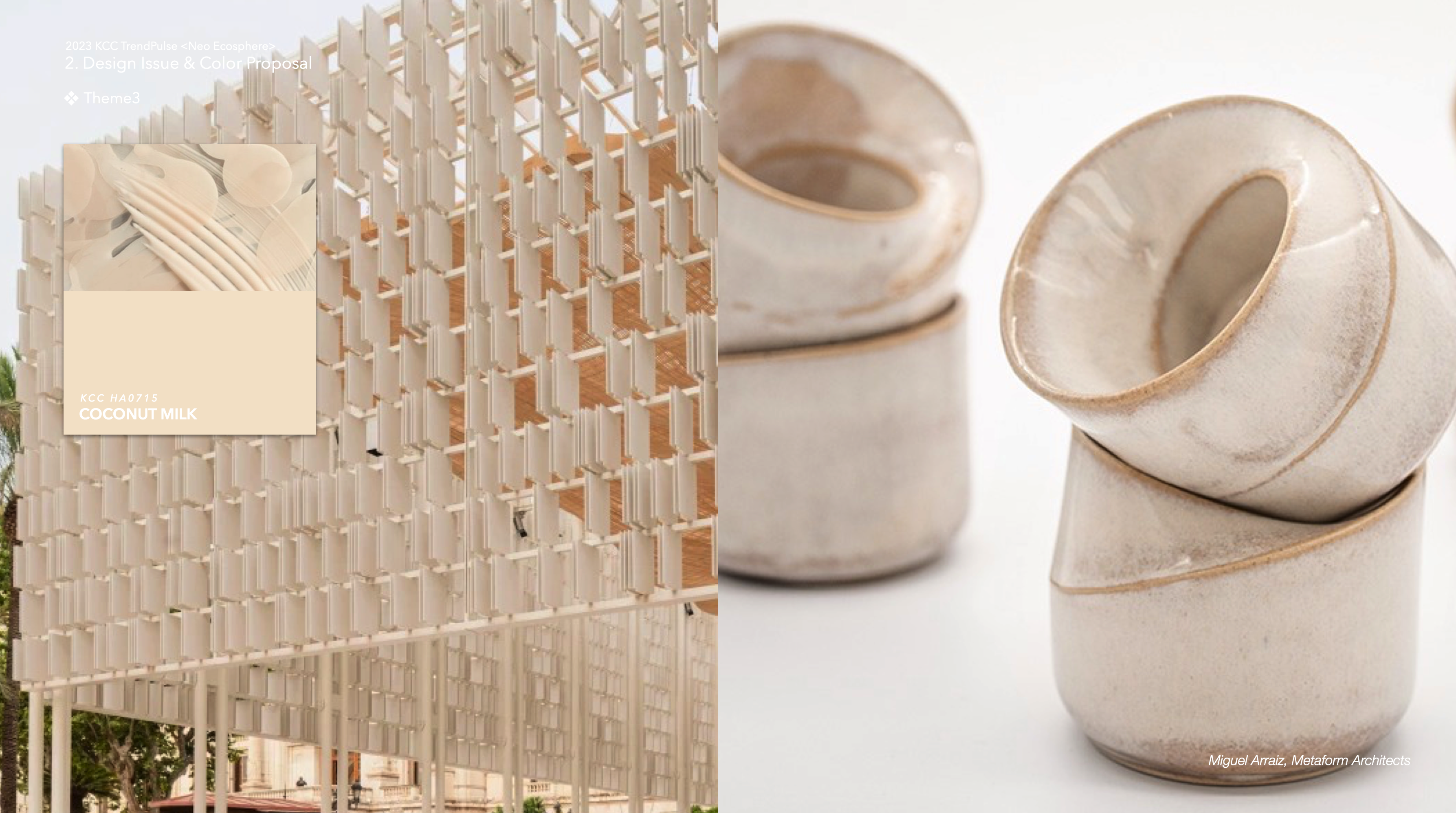 : 어릴 적 찬장에서 보았던 밀크글라스가 현재 재해석되면서, 유년의 향수와 함께 따뜻함을 주는 소재로 주목받고 있다. 광물 표면이나 유약에서 보여지는 부드러운 광은 코코넛 밀크의 소재적 특징이다. 세라믹에서 영감을 받아 고광택 마감으로 표현된 구글의 '네스트 와이파이 프로'는 전자기기 느낌보다는 하나의 오브제로 느껴지는데, 도료 타입으로 표현할 경우 광택있는 세라믹 느낌의 밀크크리어 마감이나 소프트필 도료로 표현할 수 있다.