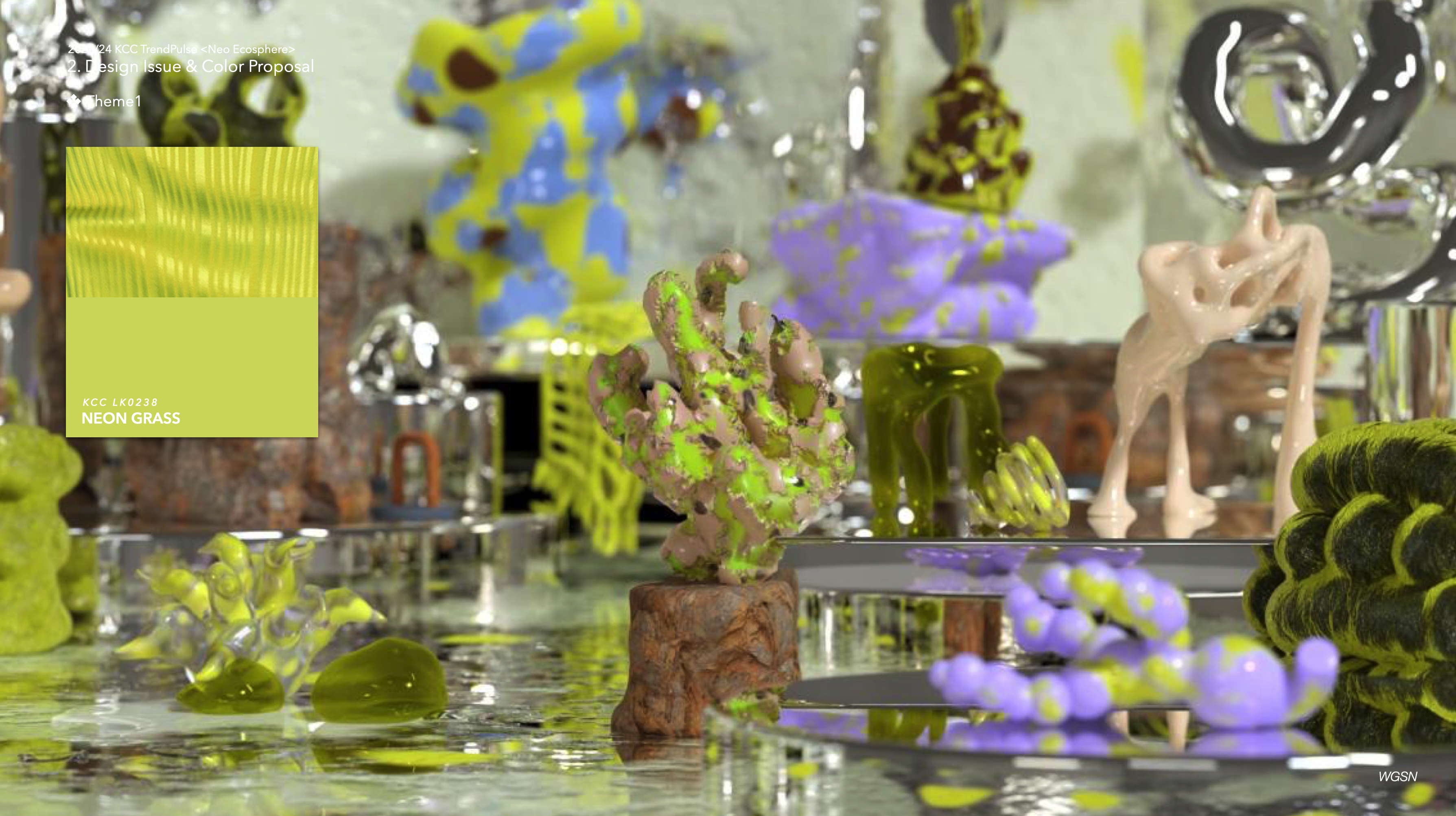 : 미네랄과 천연 소재에서 보여지는 네추럴한 그린이, 디지털화되어 차분하고 소프트한 톤으로 표현된다. 네온 그라스는 축광, 발광과 같은 네온이 가진 기능적 상징성을 가지고 있고 금속성을 띈 소재들과의 조합 속에서 네온 그라스는 디지털 네이처를 대변하는 컬러로 제안된다.
