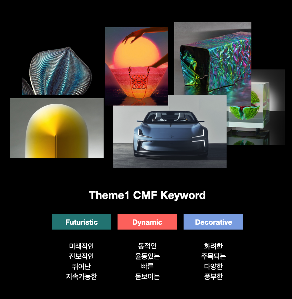 테마 1의 컬러들은 디지털과 연관된 컬러들로 구성되어 있어 전체적으로 색상(Hue)이 다채롭고 분포되어 있고, 명도(Value)와 채도(Chroma)가 높은 특징이 있다. 이제부터 컬러별 CMF 방향성에 대해 알아보자.