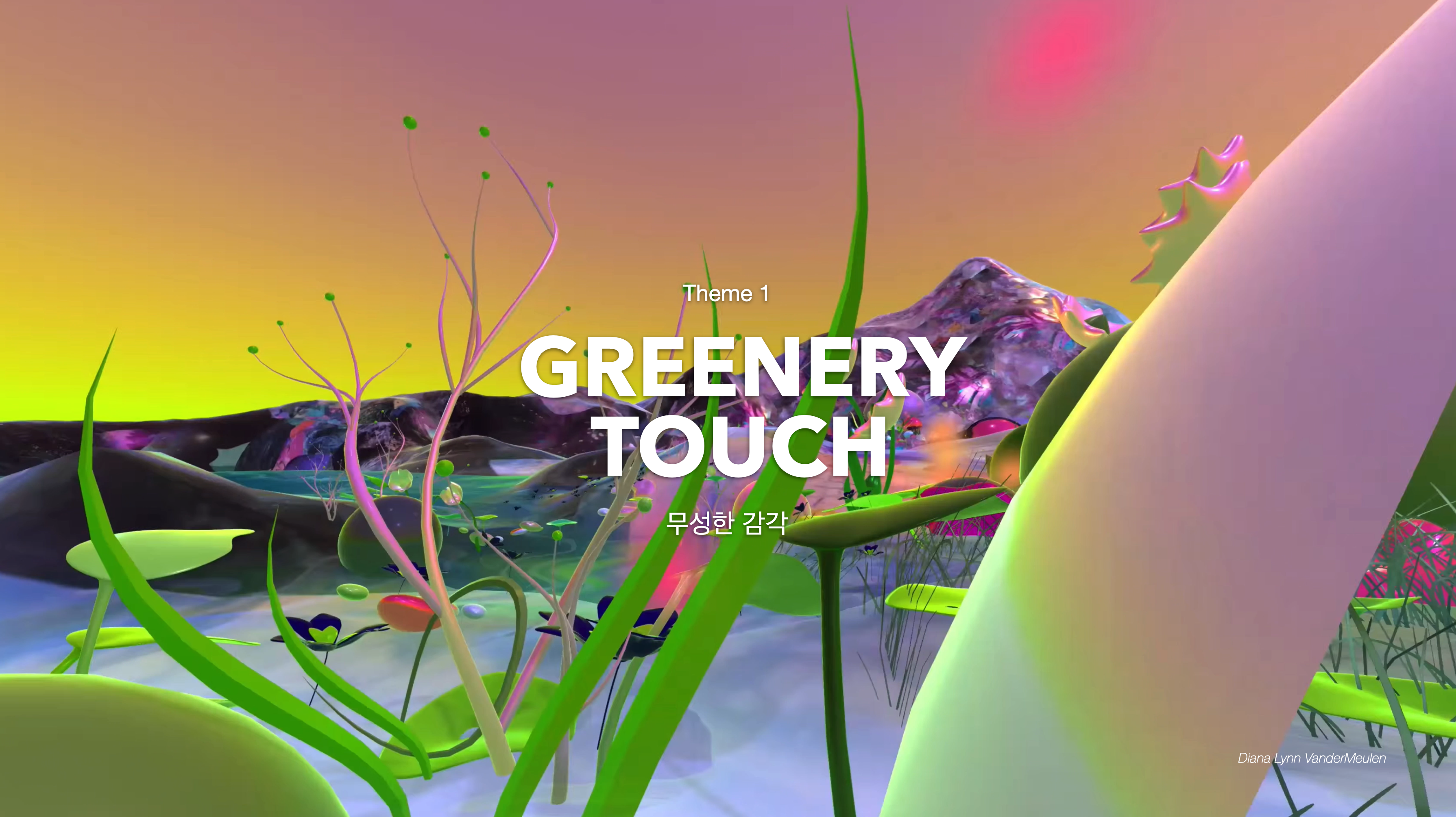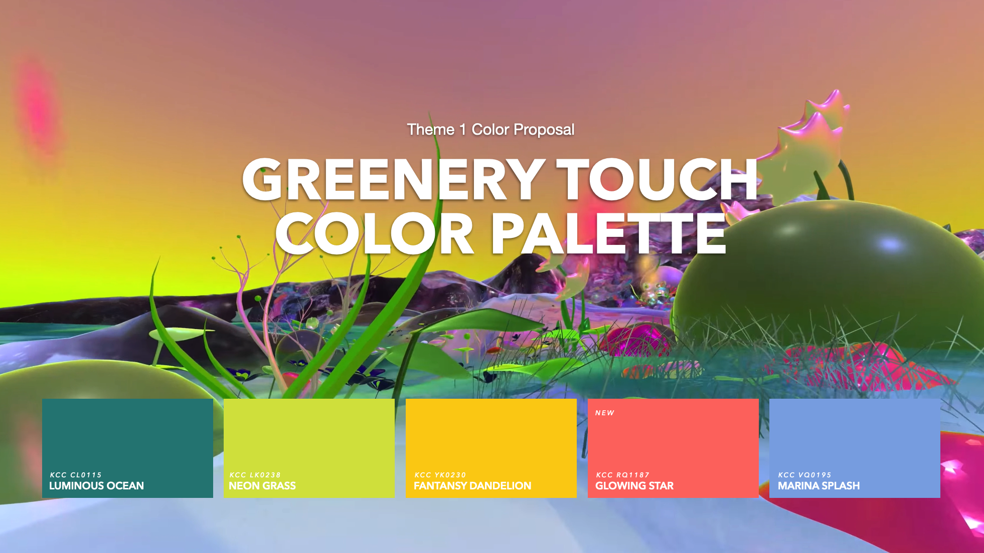 : 미네랄과 천연 소재에서 보여지는 네추럴한 그린이, 디지털화되어 차분하고 소프트한 톤으로 표현된다. 네온 그라스는 축광, 발광과 같은 네온이 가진 기능적 상징성을 가지고 있고 금속성을 띈 소재들과의 조합 속에서 네온 그라스는 디지털 네이처를 대변하는 컬러로 제안된다.