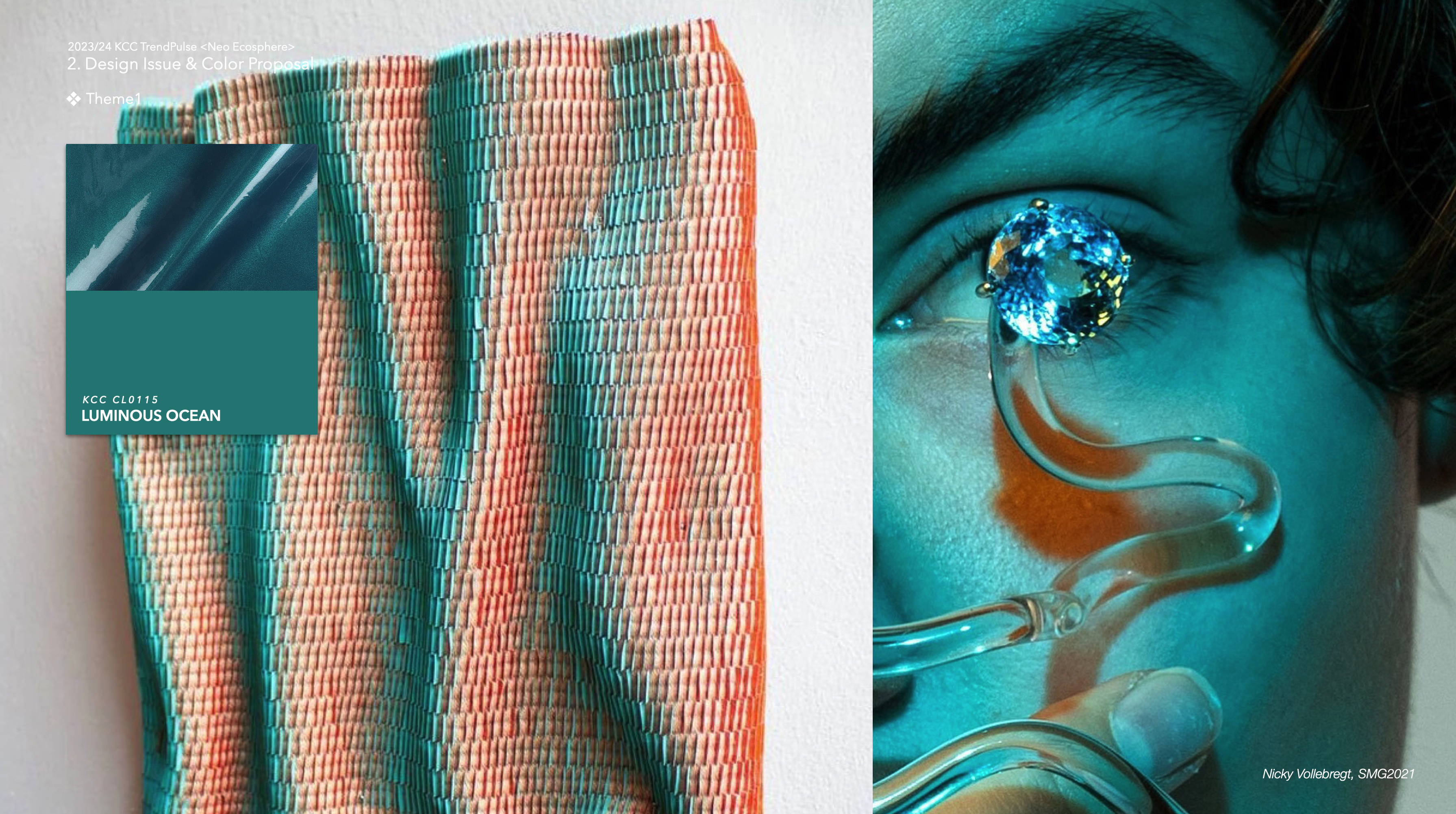 : 3D 프린팅을 활용한 공예품들과 식물을 조직적으로 시각화한 디자인들이 다채롭게 보여지면서, 디지털 네이처 속 그린과 블루는 중요한 역할을 한다. 루미너스 오션은 증착된 금속에서 보여지는 매끈하고 휘도 높은 소재와 중성적인 컬러감으로 제안된다.
