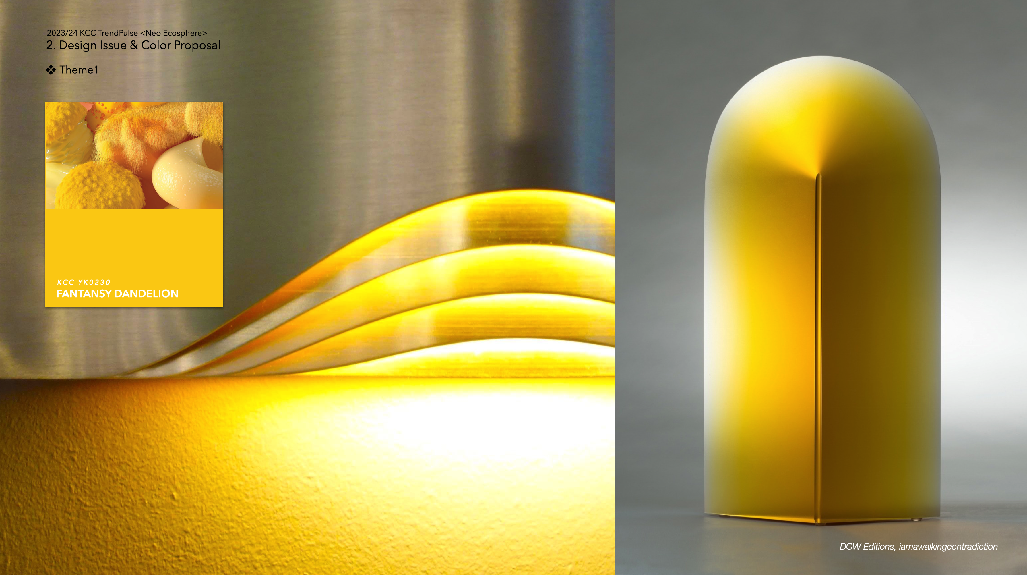 : 자연으로의 회귀가 미래의 방향성으로 자리 잡게 되면서 빛은 힘의 원천이자 중심이 되었다. 판타지 단델리온은 햇빛을 받은 사막의 모래처럼, 짙고 부드러운 옐로우 컬러로 제안된다.