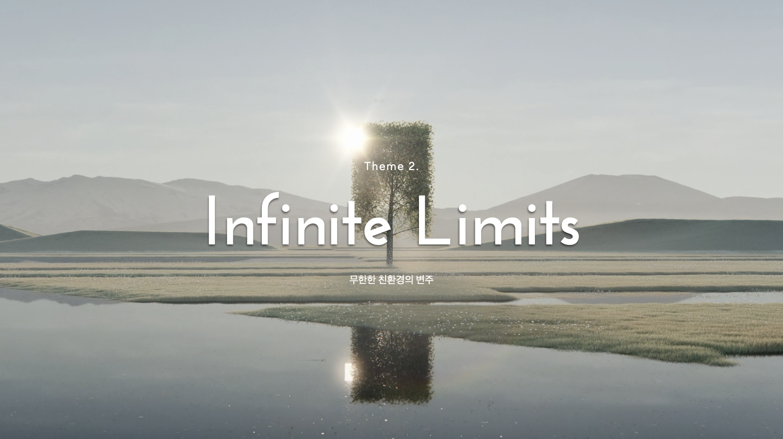무한한 것을 뜻하는 ‘inifite’와 범위를 뜻하는 ‘Limit’을 합친 단어로, 친환경이라는 카테고리 안에서의 무한한 변주를 뜻하는 단어이다. 다른 의미로는 함수의 그래프가 x축을 따라 무한으로 이동할 때 특정 값에 도달하는 것을 의미하는 ‘극한값’을 뜻하기도 한다. 이에 빗대어 두 번째 테마에선 ‘친환경’이라는 카테고리 안에서 결국에는 ‘소비자’라는 목표에 도달해 가는 무한한 과정에 대해알아보고자한다.