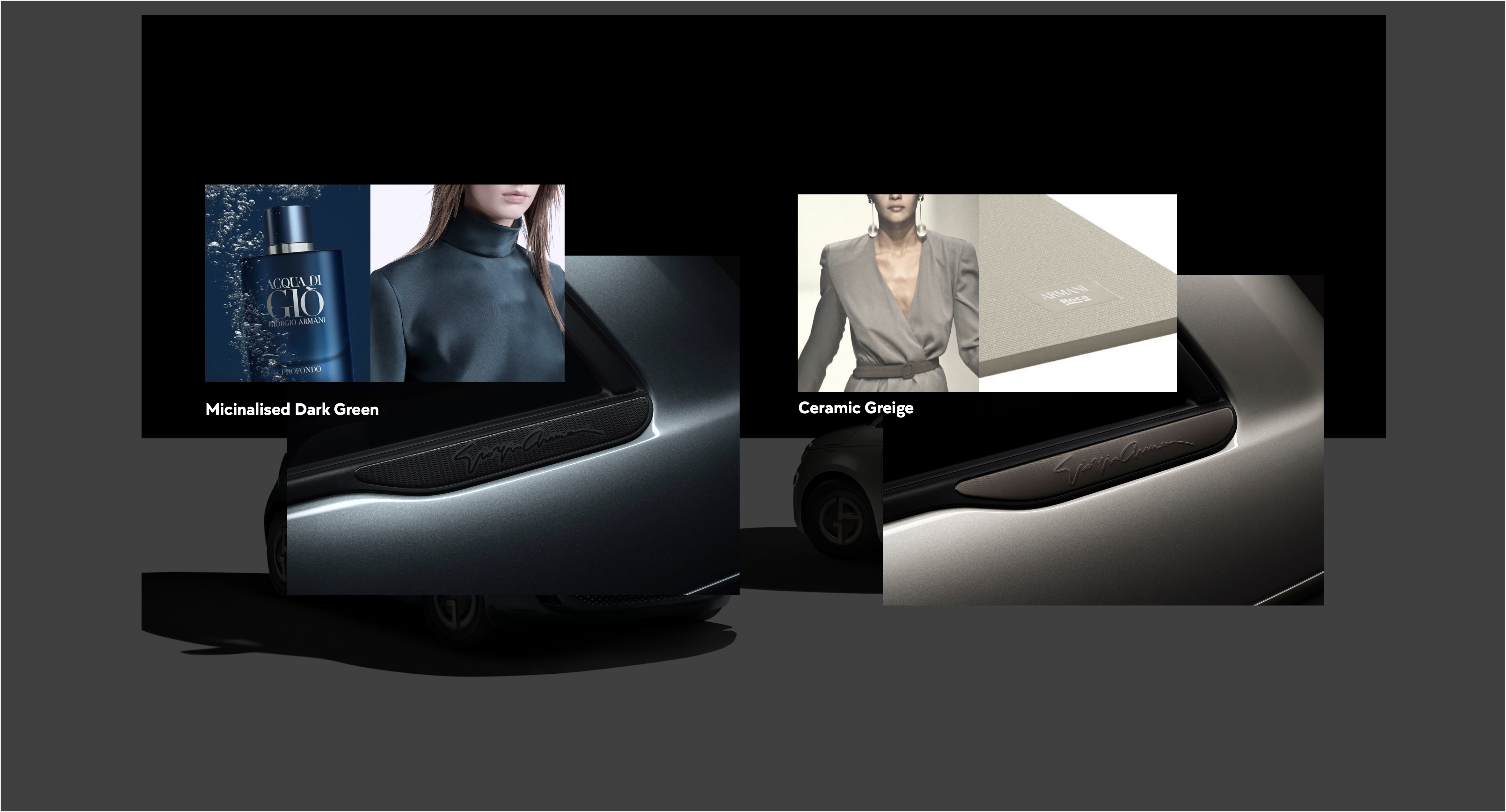 피아트는 전기차를 더 매력적인 관점으로 바라보기 위해 '아름다운 전동화'를 진행하겠다 말했다. 지오지오 아르마니와 협업한 피아트 500e는 아르마니의 시그니처 컬러 미니사이즈드 다크그린과 세라믹 그레이지를 선보였고, 대쉬보드에 패브릭같은 텍스쳐를 가진 레이저컷 목재를 사용해 친환경의 혁신적인 아름다움을 보여주었다.