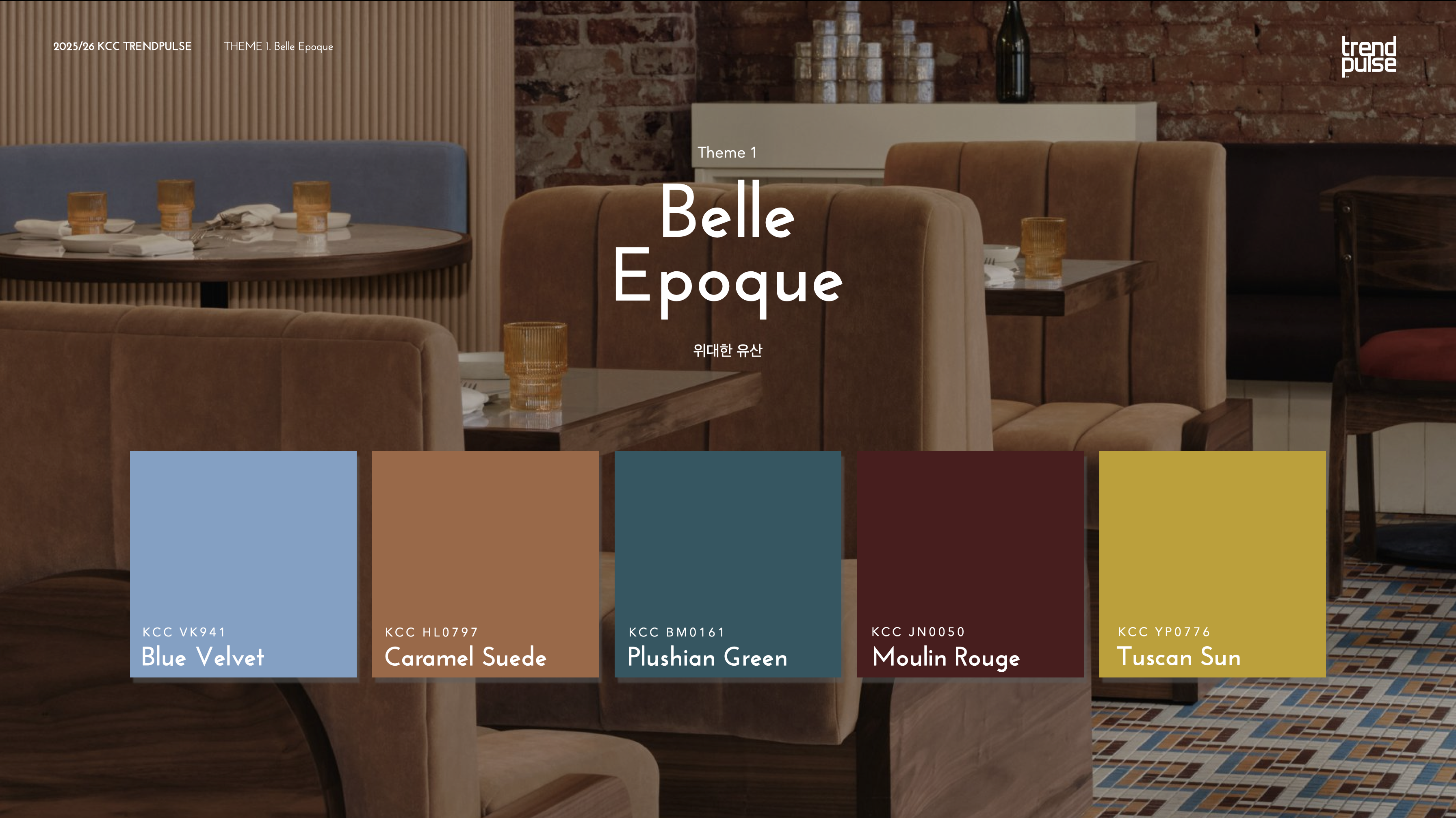 2025/26 KCC TrendPulse 인테리어 트렌드 파트에서는 개인성과 자율성이 중시되는 사회 속 다양한 유동적 변화들이 공존하는 모습에 대한 이야기로, 총 3가지의 테마를 제안한다. 그 중 이번 포스트에서는 3가지 테마 중 첫 번째 테마, 우리의 마음 깊숙한곳에 자리잡은 노스텔지어를 담은 Belle Epoque 의 트렌드 컬러를 소개한다.