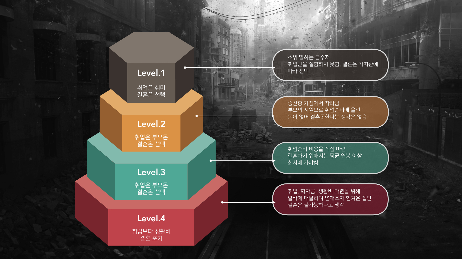 그들이 견고하게 만든 계층 구조 속에서 이동이 불가능하다는 사회 현실은 사람들에게 ‘희망’이란 단어를 잊게 만들고 있다.