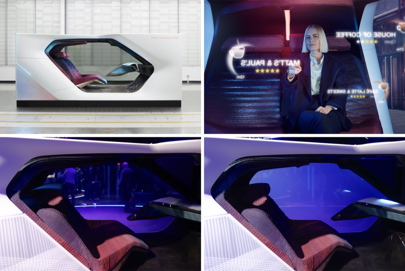 BMW와 Designworks가 협업하여 공개한 BMW i Interaction EASE는 몰입감 있는 실내공간을 위해, 외부는 박스형태로 하여 관심에서 완전히 배제시켰다. 그 만큼 차량 내부 공간에서의 활동에 집중한다는 것이다. 제스처, 음성, 운전자의 시선을 따라 직관적으로 커뮤니케이션하고, 승객이 차량밖으로 시선을 돌리면, 센서가 이를 식별하고 이에 관련된 정보를 표시해주는 시선탐지 기능까지 갖췄다. 또한, 투명에서 불투명으로 변하는 스마트유리 외관으로, 엔터테인먼트를 즐기거나, 단순히 프라이버시 보호를 위해서 불투명 모드로 설정 할 수 있게하는 스마트 유리를 적용했다. 발판, 크고 편안한 좌석, 넓은 헤드라이너와 개인 사운드 구역은 실내에서의 편안함과 엔터테인먼트를 즐길 수 있는 환경을 제공한다.