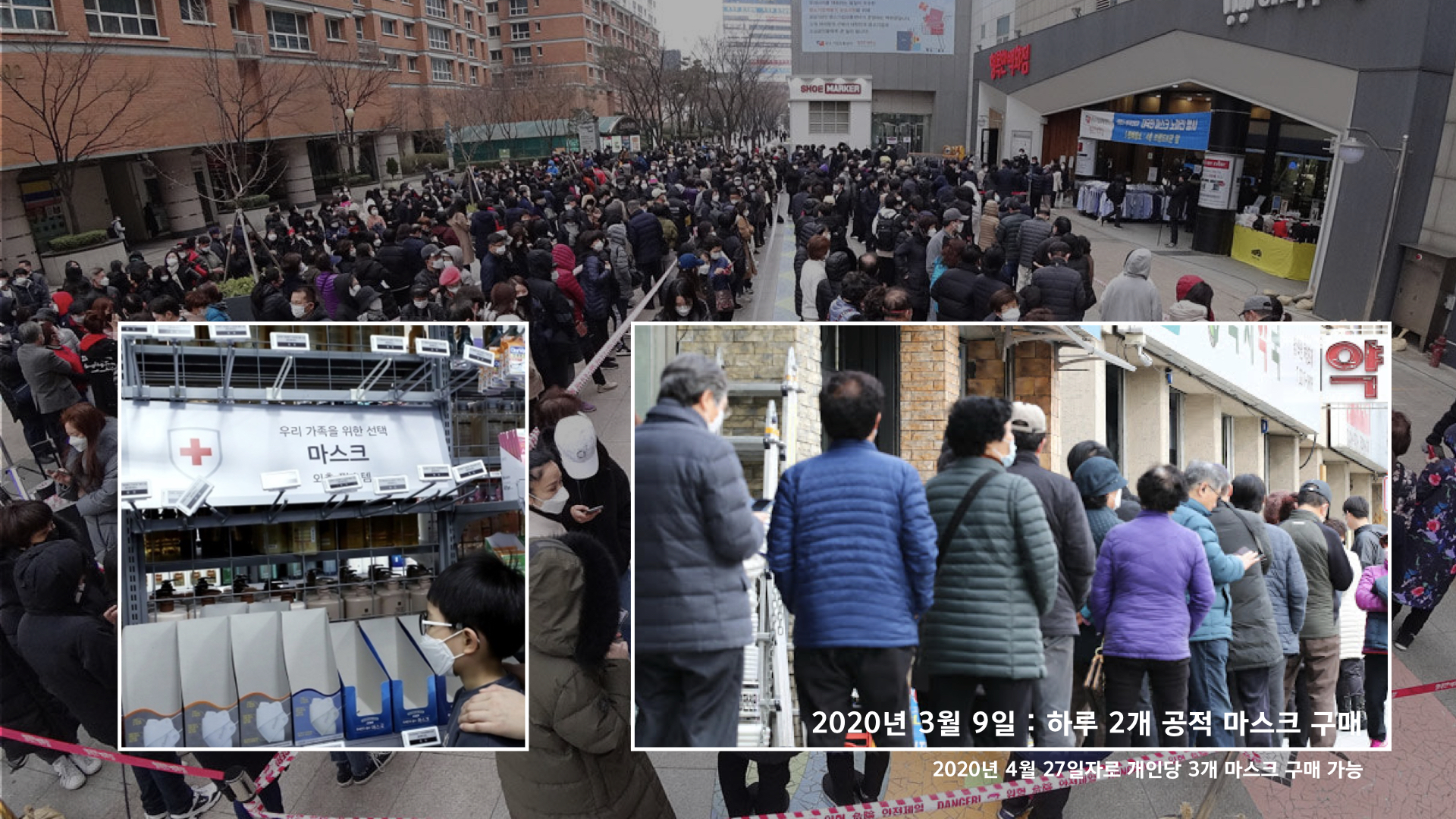 서로의 건강을 묻는 인삿말과 마스크와 손소독제를 구하기 위해 줄을 서고