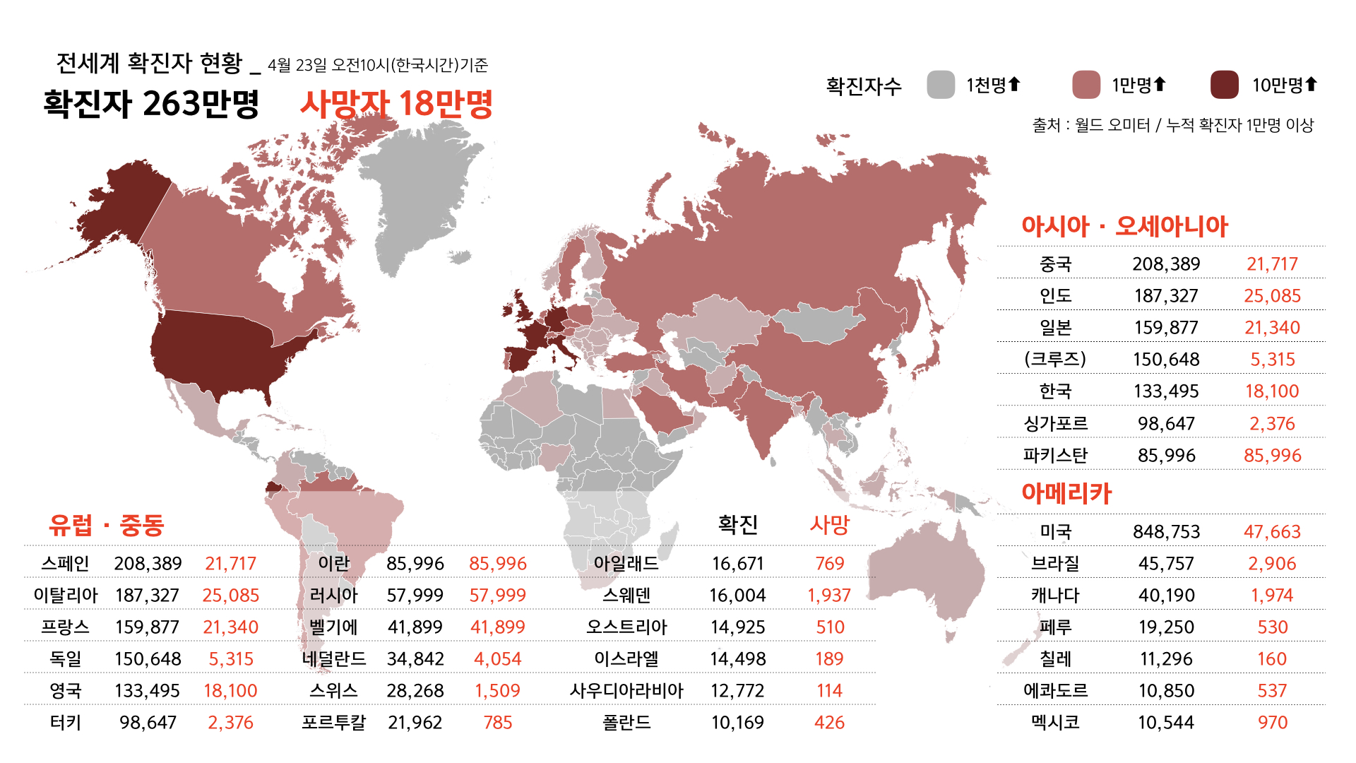 전 세계 230여개 국가 중 87%에 달하는 국가가 코로나 바이러스에 노출되었으며,