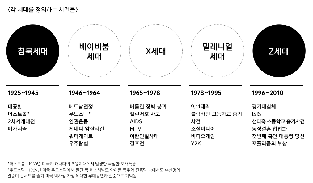 어느 세대도 출생년도를 명확하게 나누기는 어렵지만, Z세대 전문가인 제프프롬과 앤지 리드는 대략 1996년부터 2010년까지의 출생자를 Z세대로 규정하고있다. UN통계 기준으로 전 세계 인구의 32%, 현재 10대~20대 초중반 연령의 청년을 가리킨다. 미국의 Z세대는 최근 우리가 기억하는 세계적인 사건들을 유년기에 보낸 세대다. 2001년 9.11테러로 ‘안전’에 대한 위협을 간접적으로 받았고, 2008년 미국발 금융위기, 2009년 유럽 재정위기를 거쳐 세계 경제의 저성장 국면에서 유년기를 보내고, 무차별 테러, 총기난사 사건으로 내 주변의 친구와 가족이 세상을 떠나는 슬픔을 겪은 세대.