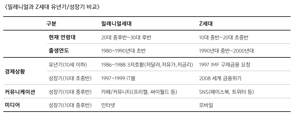 한국의 밀레니얼과 Z세대를 나누는 것은 바로 1997년 외환위기 IMF의 경험이다. 한국의 밀레니얼은 1980년~1990년대 초반 출생하여 현재 20대 중반~30대 후반의 연령대를 이루고 있다. 이들은 베이비부머의 자녀로서 80~90년대에 지속적인 경제성장과 함께 풍요로운 유년기를 보냈다. 그래서 우리 가족과 사회는 더 잘 살 수 있을거라는 낙관적인 전망을 갖고 성장했으며, 청소년기에 IT붐으로 인터넷이 대중화(싸이월드, 세이클럽)되면서 자신의 정보를 모두 공개하면서 폭넓은 인간관계를 맺어왔다는 특징이 있다. 베이비부머는 ‘경험이 부족한 네가 뭘 아니, 조금 더 참아봐’ 라며 인내를 가르쳤고, 대체적으로 ‘넌 뭐든 할 수 있다. 모두가 승자가 될 수 있다’는 낙관적인 미래관으로 자녀를 교육한 편이다.