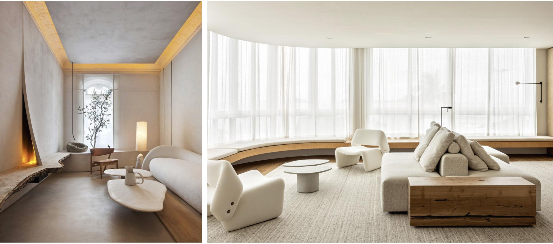 그동안 용납되지 않던 붓자국 혹은 손자국, 자연스러운 나뭇결 등도 보이며 마치 굴곡진 면을 따라 자유롭게 흘러가는 물처럼 선은 자연스럽게 표현된다. 평온한 느낌을 줄 수 있도록 소음을 흡수할 수 있는 패브릭이 몽글몽글한 형태와 함께 적용되기도 한다. 극단적으로 완전함을 추구하던 미니멀리즘이 불완전함을 수용하는 순간 공간의 분위기는 거의 반전에 가깝게 달라진다. 여전히 디자인 요소의 최소화를 표방하는 정신은 이어가지만, 표면 마감과 라인의 변화로 미니멀리즘이 전혀 다른 얼굴을 드러낸다.