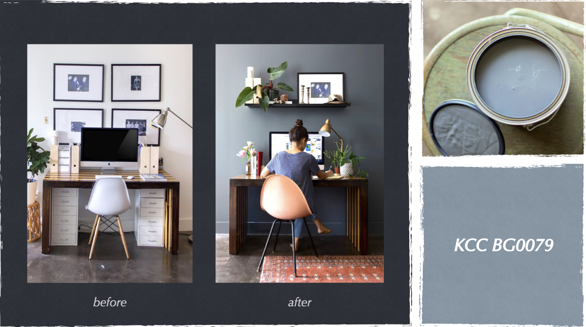 집에 가구도 있고 벽을 바라보고 앉았으며 동료식물까지 완비되어 있는데 무슨 까닭인지 모르게 산만하다면 홈오피스 공간의 벽 컬러를 바꿔보는 것도 좋은 방법이다. 취향에 맞춰 다양한 컬러를 도전해볼 만 하지만, 업무 집중도를 높이기 위해서는 그레이가 적당하게 섞인 톤 다운된 블루나 그린을 추천한다. 단정하고 정돈된 느낌을 주면서도 눈도 마음도 편하게 하는 컬러이기 때문이다. (KCC 컬러뱅크 BG0079 추천)