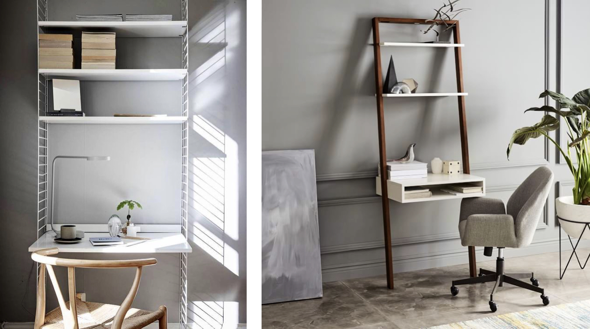 어느 공간이든 자투리 공간이 생기면 슬쩍 기대어 사용할 수 있는 사다리형 데스크도 추천한다. 근래 홈오피스를 꾸미는 소비자가 급증하며 자주 눈에 띄기 시작한 형태의 가구이다. 언제든 자유롭게 이동이 가능한 프리스탠딩(free standing)형으로, 수납형 데스크와 마찬가지로 선반을 달기 위해 벽에 못질을 하지 않아도 수납이 가능하다는 큰 장점이 있다.