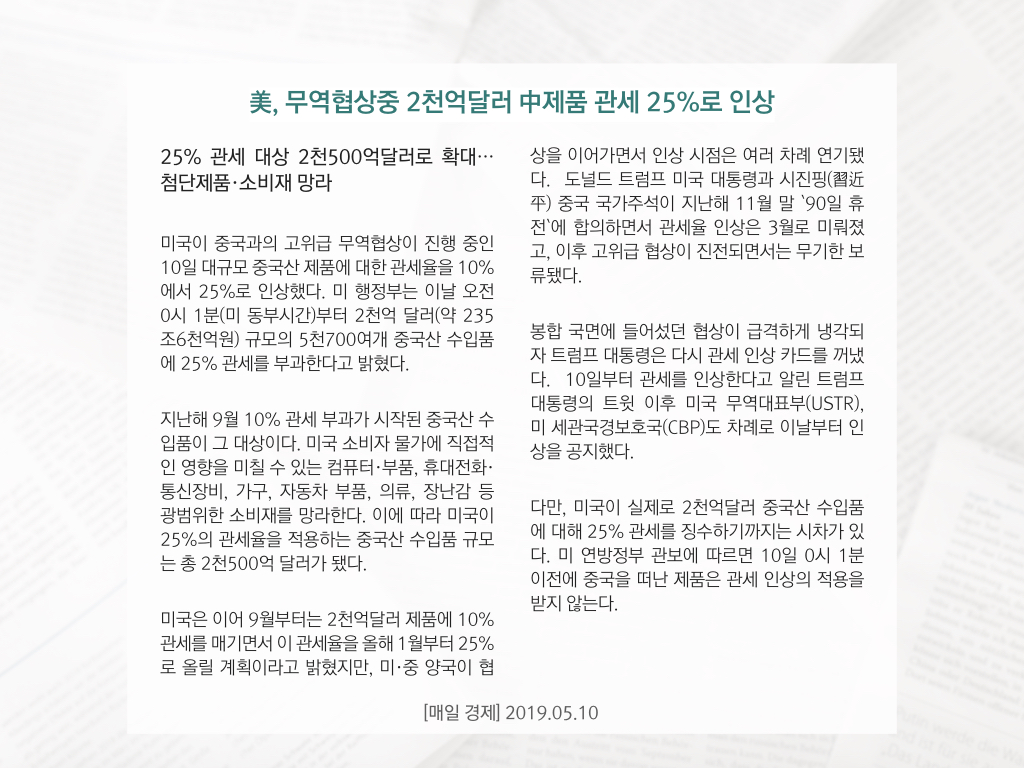 중국 수출이 전체의 약 25%가 넘는 우리에게 미국과 중국의 분쟁으로 예측되고 있는