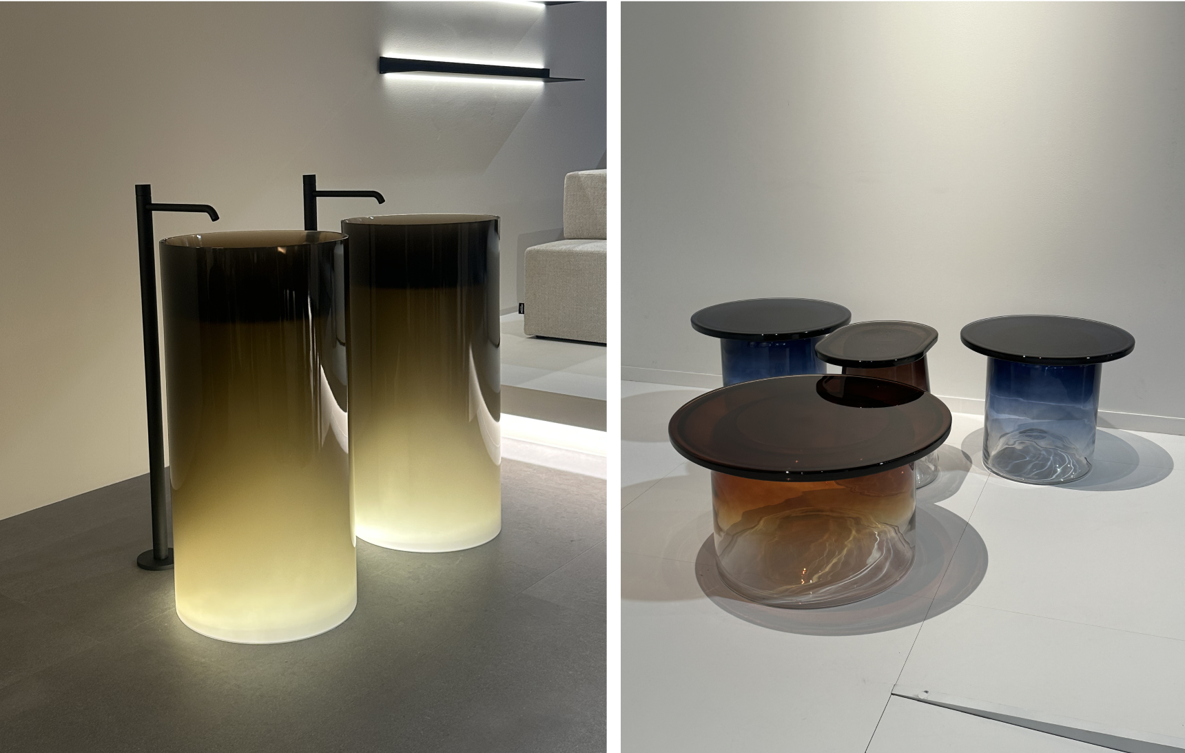 마지막 특징은 색의 흐름을 다루는 방식, 특히 그라데이션의 변화다. 이전까지 그라데이션은 톤온톤 기반의 미묘한 명도 변화로, 공간의 깊이를 부드럽게 더해주는 보조적 장치였다. 하지만 2025년의 그라데이션은 단호했다. Bold Gradation이라는 이름 그대로, 올해의 그라데이션은 더 이상 부드러운 연결이 아니다. 어두운 컬러에서 투명에 가까운 유리로 확연히 전환되는 글라스, 블랙에서 화이트로 단호하게 이어지는 패브릭은 그라데이션이 시각적인 흐름이 아닌, 디자인의 주체적 장치로 기능하고 있음을 보여주었다.