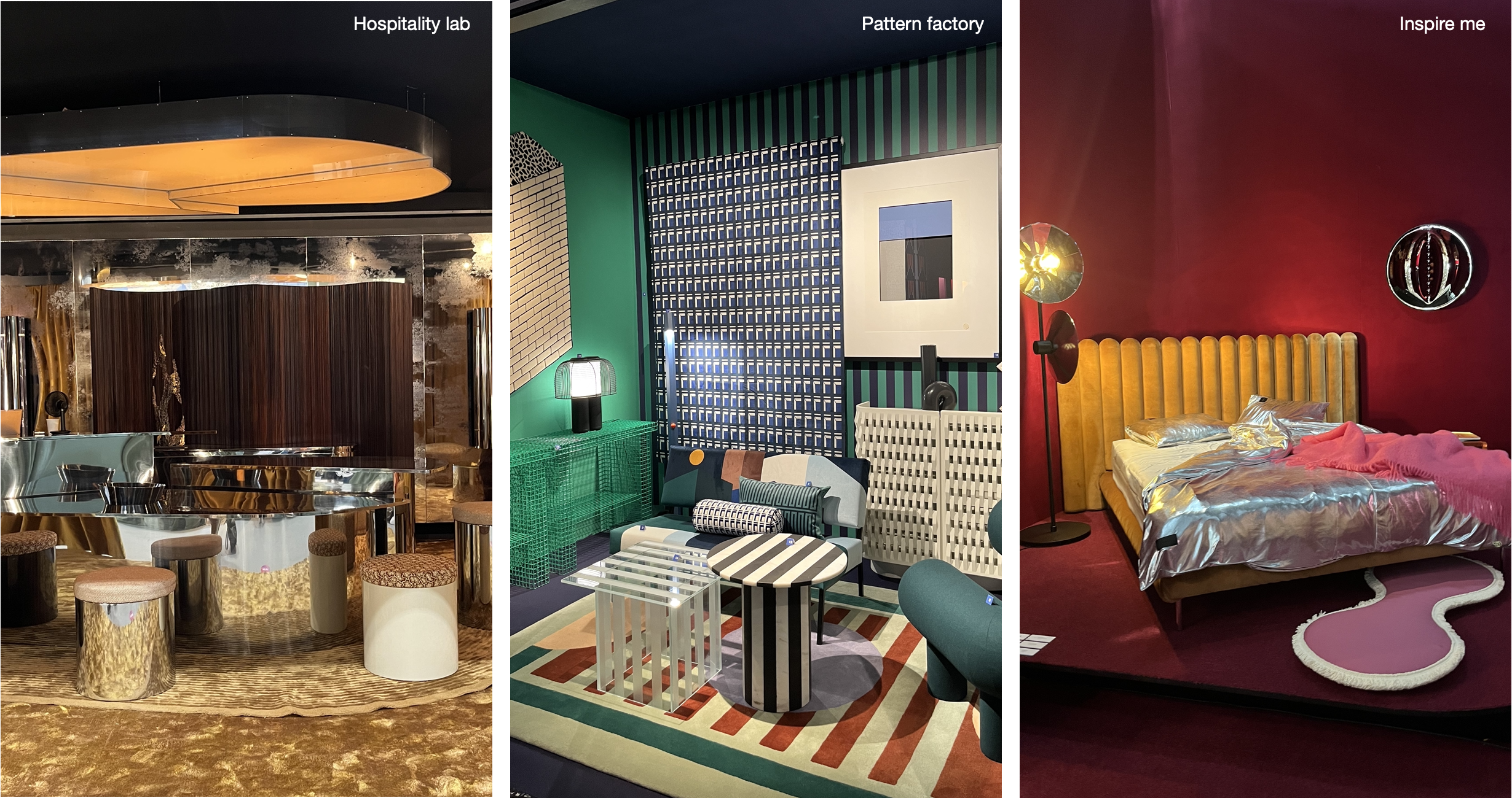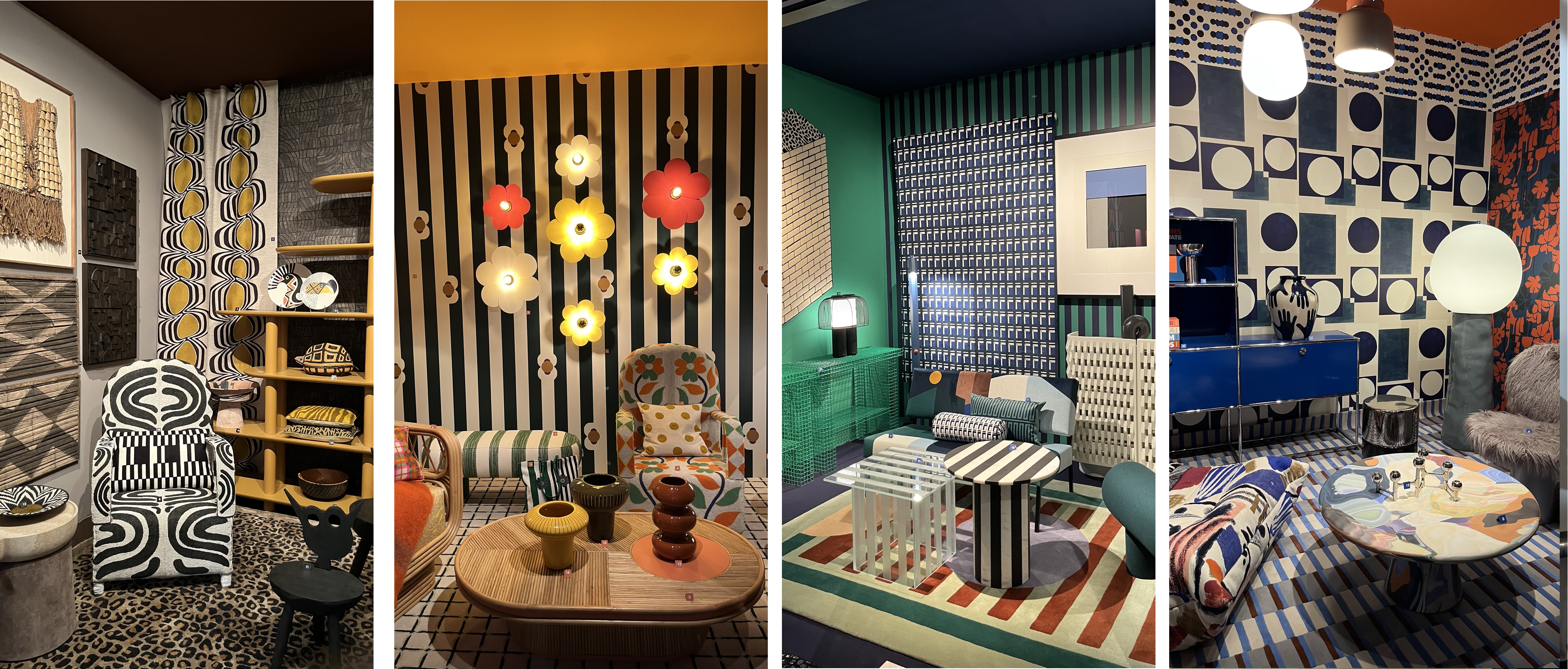 화려함 속에서 찾는 즐길거리가 시선을 사로잡는다. 수많은 패턴 속 패턴 팩토리, 일상적이지 않은 오브제들 속 영감을 얻는 인스파이어 미 처럼 맥시멀한 제품과 연출도 돋보였다. 다양한 전시에서 다양한 컬러부터 벽지, 패턴, 소품까지 전반적으로 즐거움을 극대화하는 화려한 연출이 돋보이고, 이들이 조합되고 섞이고 병치되며 독특한 이미지를 형성한다.
