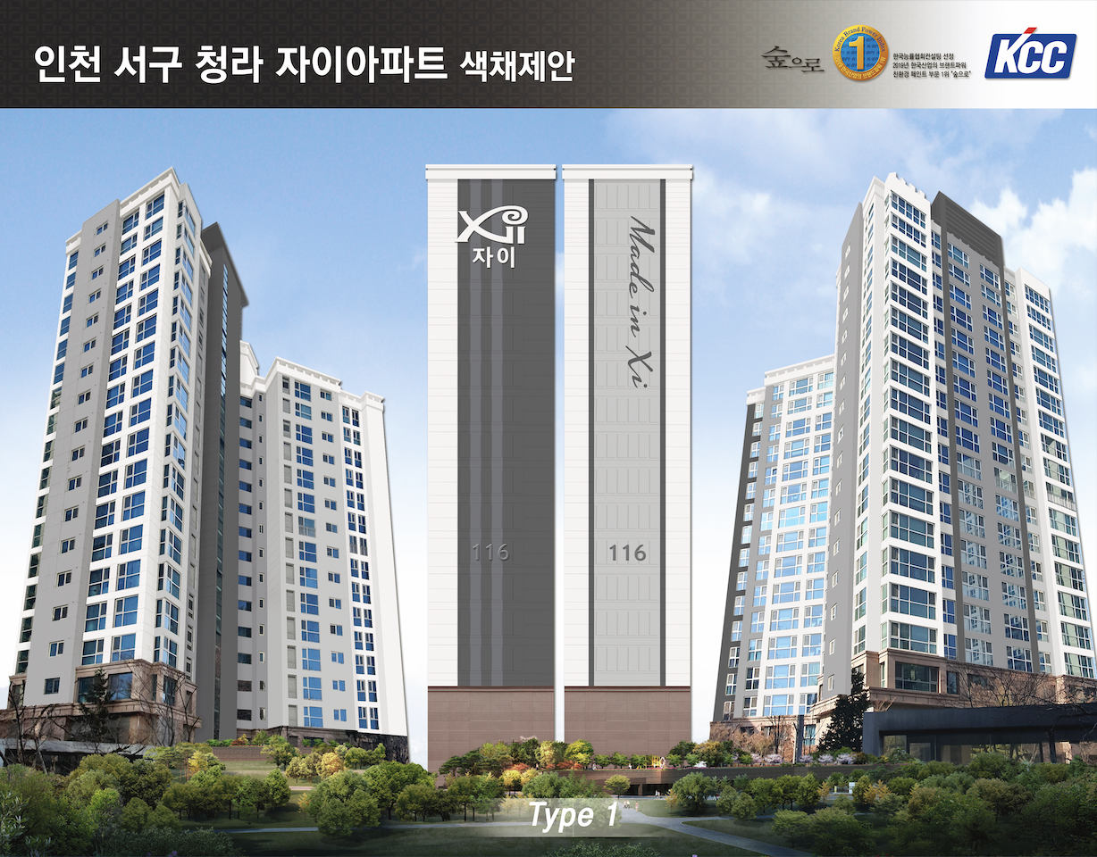 청라 자이아파트는 Grayish톤을 적용한 대표적인 현장이다. 청라신도시의 대표 현장인 청라 자이아파트에 가장 적합한 외관 디자인을 위해, KCC는 주변 환경을 고려한 색채선정과 신축 스타일을 반영한 세련된 디자인을 적용했다. 이 프로젝트를 시작으로, KCC는 청라신도시의 다양한 구축 아파트를 대상으로 신축 스타일을 반영한 재도장 디자인을 진행하고 있다.