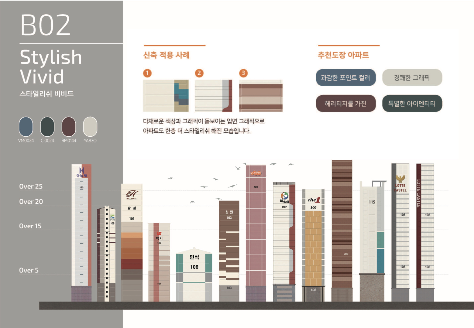눈에 확 튀는 브랜드 컬러에 다채로운 그래픽까지 더하면, 단연 돋보이는 아파트 디자인을 완성할 수 있다. 주로 확고한 아이덴티티나 헤리티지를 가진 현장이나, 주변과의 차별화를 꾀하는 중.소규모 단지에 활용하면 경쾌하면서도 센스있는 디자인이 된다. KCC에서는 신축 스타일 분석을 통해 재도장 현장에도 적용가능한 다양한 그래픽을 개발하고있으며, 이를 바탕으로 단지의 품격을 높이는 특별한 그래픽을 제안한다.
