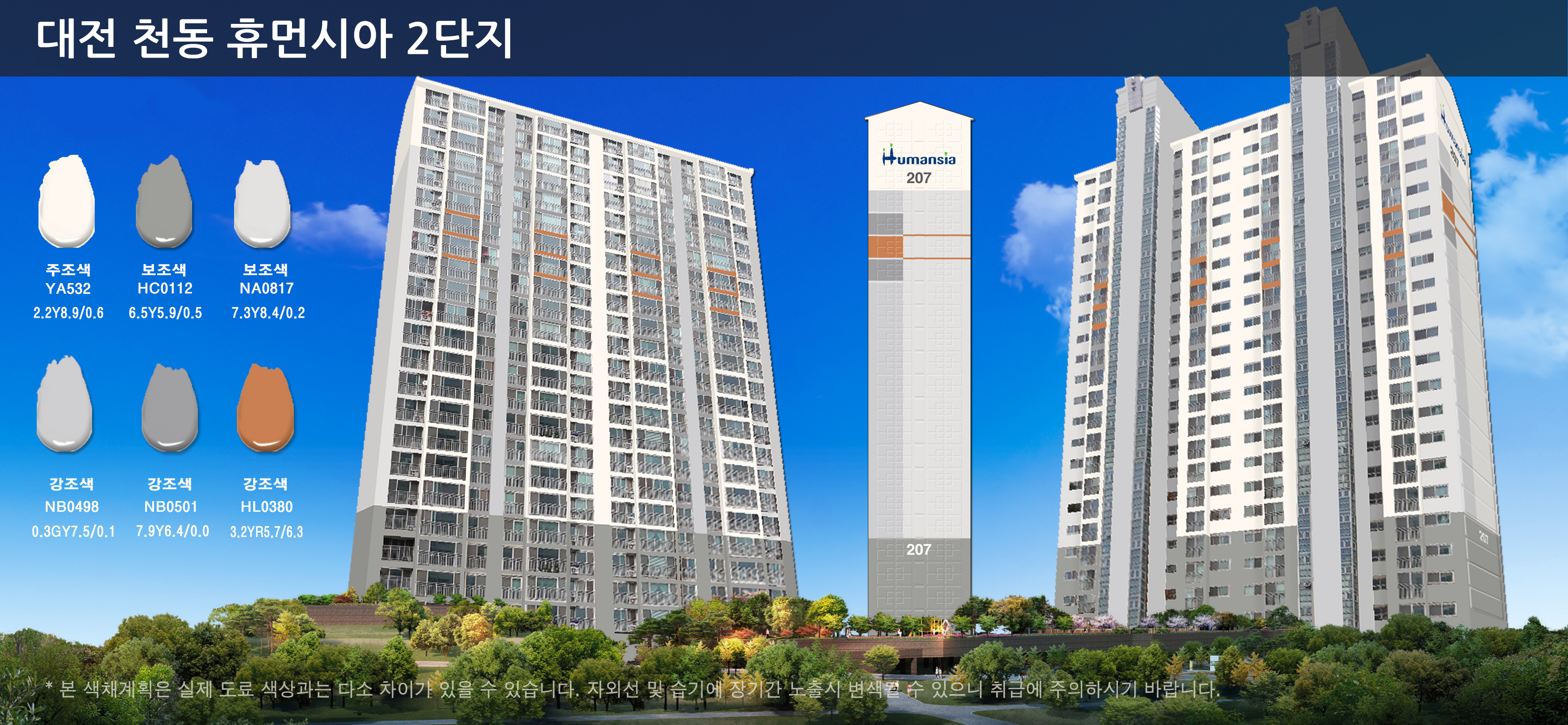 대전 천동의 휴먼시아 2차 아파트는 Soft 스타일로 재도장했다. 세로 분할로 더 높아보이는 디자인을 연출하고, 소량의 강조색으로 아이덴티티를 표현하여 깔끔함을 강조했다.