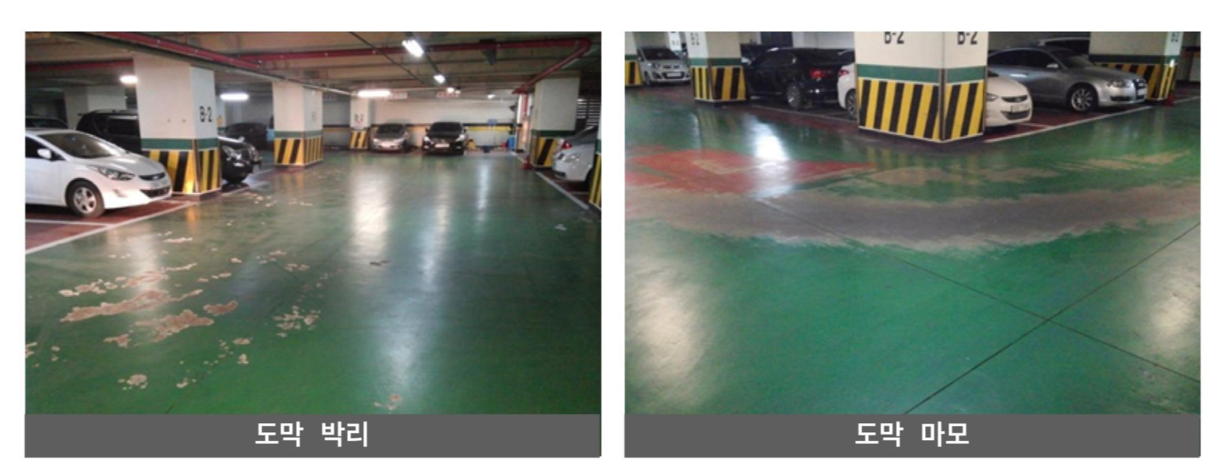 도장한 부분의 도막이 벗겨지는 박리, 마찰로 인한 도막의 마모, 그리고 도막에 금이 가 생기는 크랙이다. 이들은 방치되었을 때 심미성을 저하시키는 원인이며, 장기적으로는 건축물의 노화를 가속시킨다. 특히 바닥면의 크랙이나 박리는 타이어 마모를 촉진시켜 자동차에 직접적인 영향을 미치기도 한다. 아파트의 외관과 마찬가지로 지하주차장에도, 세월의 흔적으로 발생한 상처들을 제때 치료하기 위해 적절한 시기에 수선 계획이 필요하다는 것이다.