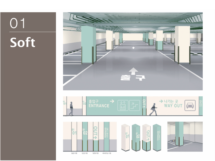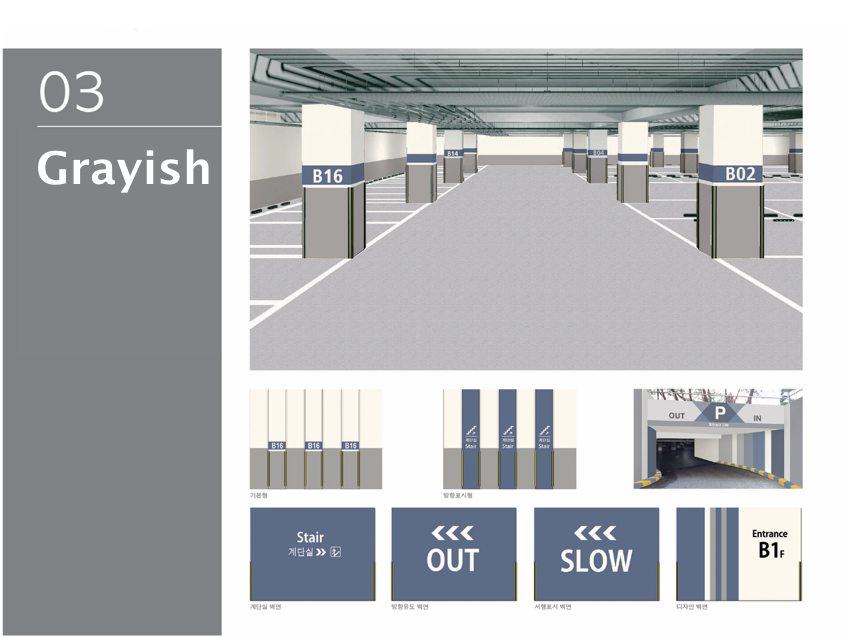 지하주차장 전반적으로 그레이 톤의 컬러가 선호되면서, 이와 조화롭게 어울리는 파스텔톤, 그리고 채도 낮은 차분한 컬러들이 함께 사용되고 있다. 또한 지하주차장 내 컬러 사용 면적이 점차 줄어들고 동출입구와 기둥, 램프구간 등에서도 심플한 그래픽과 차분한 컬러 사용이 두드러진다.