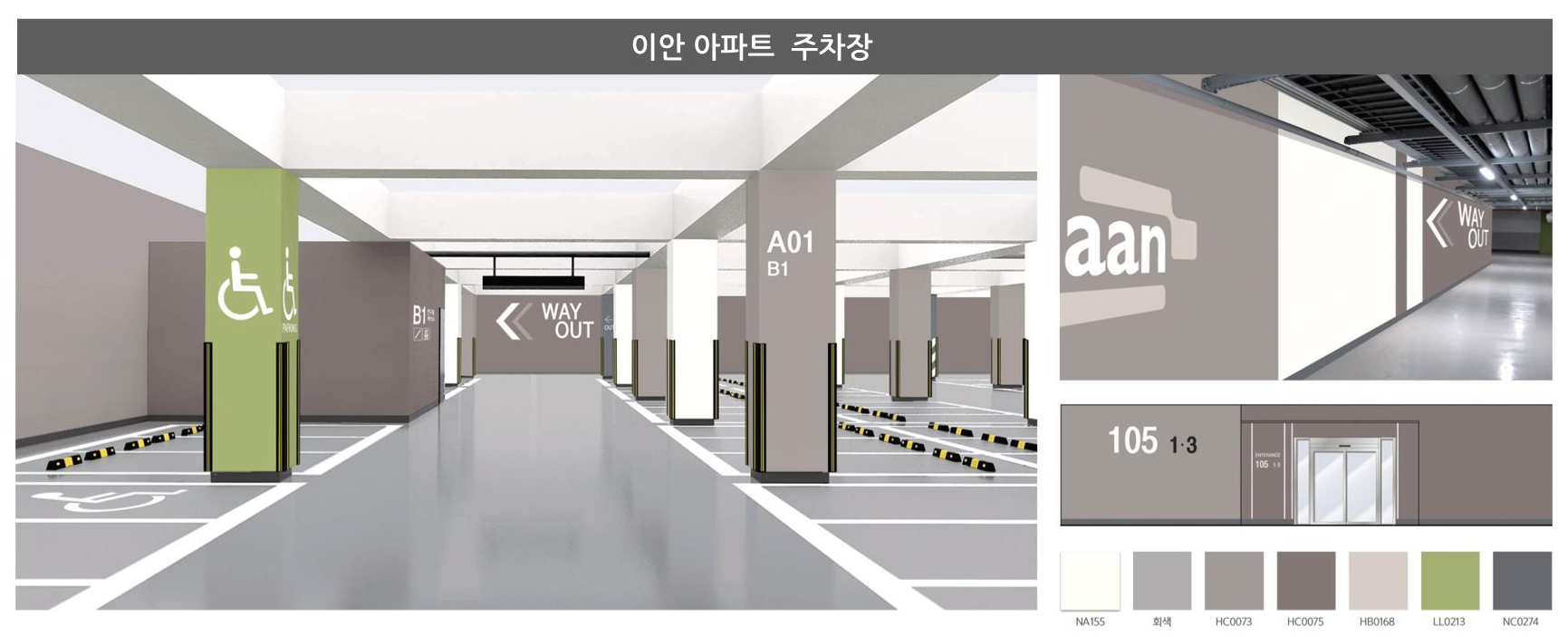 이안 아파트의 주차장은 브라운 컬러를 다양한 톤으로 활용하여 부드럽고 따뜻한 주차장의 분위기를 완성했다.