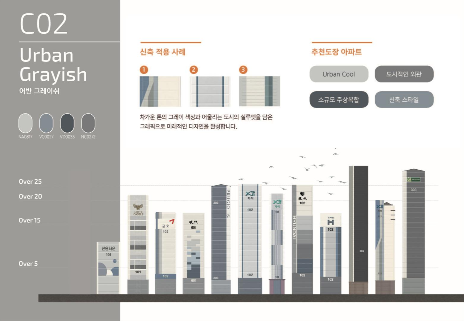도시의 색감을 담은 차가운 톤의 그레이 배색은 다양한 건설사의 신축 아파트 스타일에서 가장 주목받는 디자인이다. 특히 쿨톤의 그레이 컬러는 작은 색상 차이가 적용되었을때 이미지의 큰 변화를 불러오기 때문에, 분석을 통해 현장에 가장 적합한 컬러를 선택하는 것이 무엇보다 중요하다. KCC는 다양한 건설사와의 브랜드 컬러 개발 협업 사례를 통해, 분석을 통해 가장 적합한 컬러와 디자인을 제안할 수 있다.