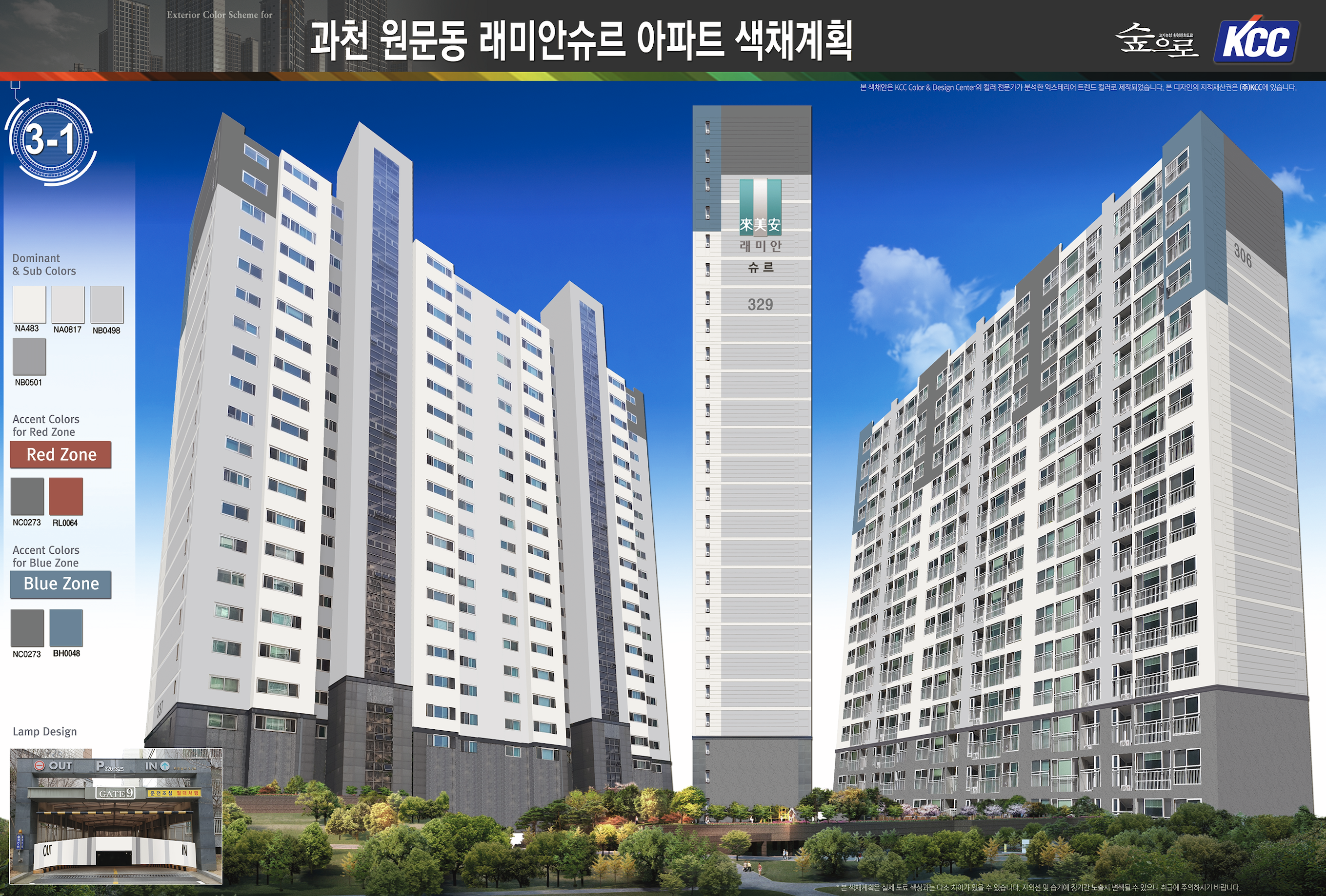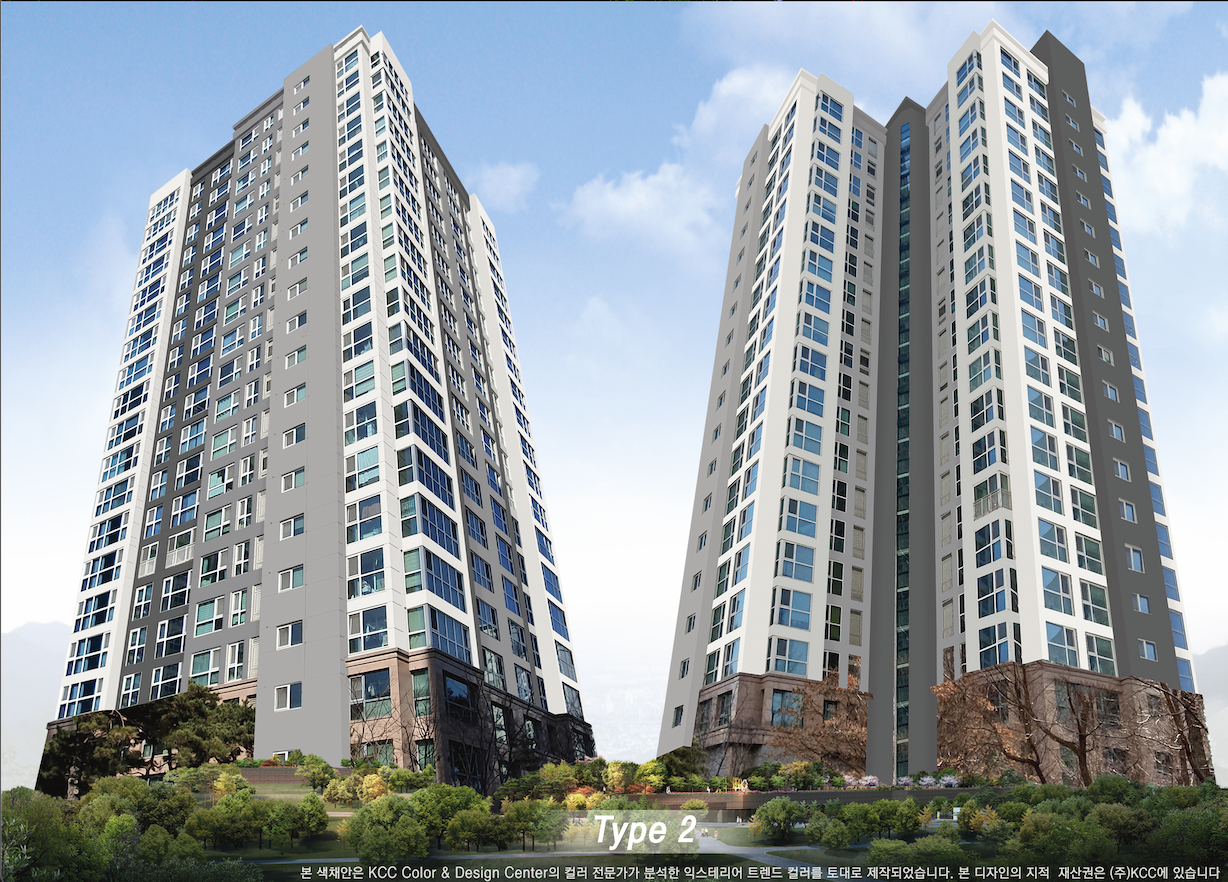 청라 자이아파트는 Grayish톤을 적용한 대표적인 현장이다. 청라신도시의 대표 현장인 청라 자이아파트에 가장 적합한 외관 디자인을 위해, KCC는 주변 환경을 고려한 색채선정과 신축 스타일을 반영한 세련된 디자인을 적용했다. 이 프로젝트를 시작으로, KCC는 청라신도시의 다양한 구축 아파트를 대상으로 신축 스타일을 반영한 재도장 디자인을 진행하고 있다.