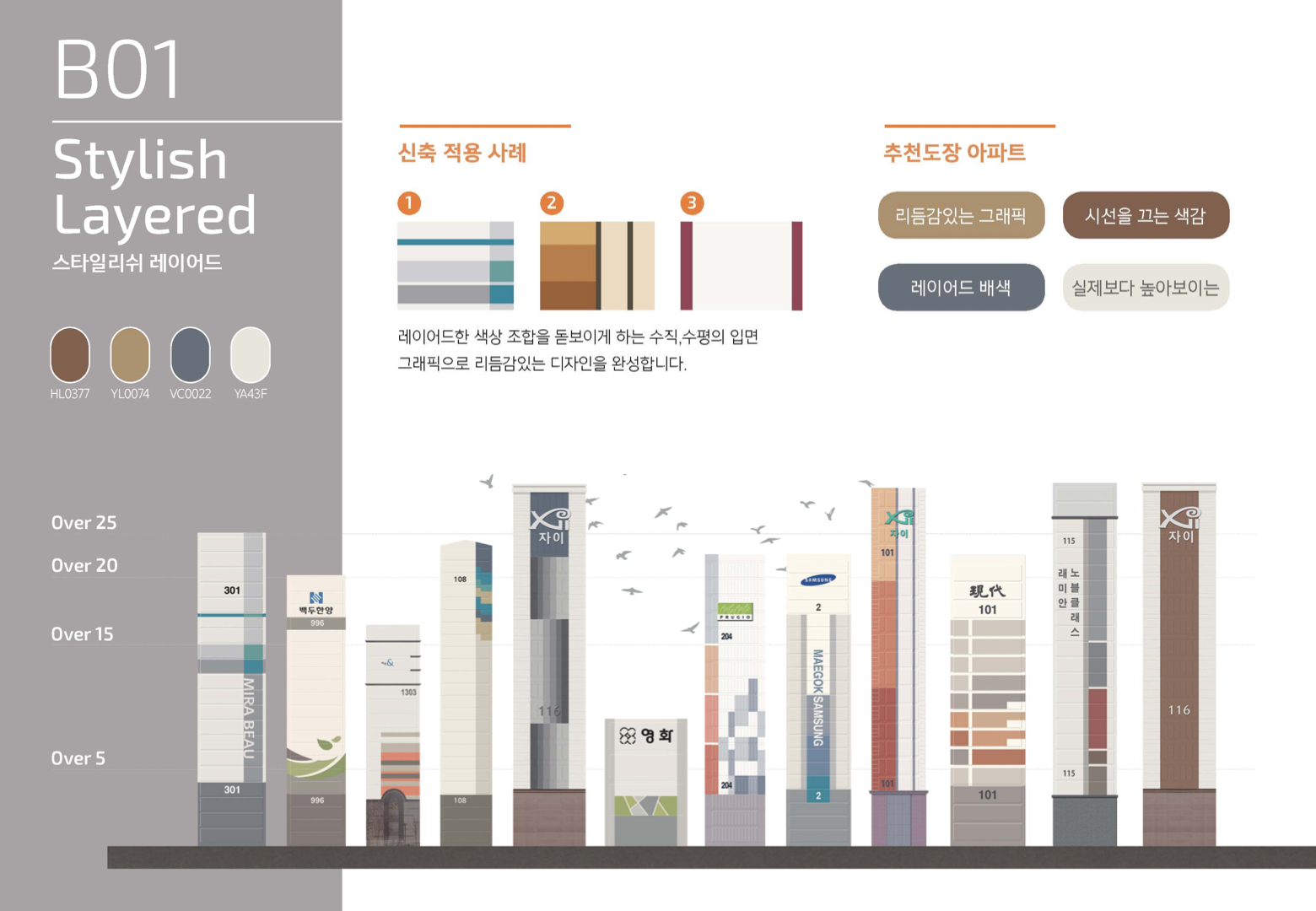 브랜드의 시그니쳐 컬러를 강조색으로 사용하고, 비슷한 색상의 파스텔 톤 컬러를 레이어드해 경쾌하고 리듬감이 느껴지는 디자인이다. 특히 가로 방향 스트라이프 형태로 분할하여 색상을 레이어드하면 실제보다 높아보이는 외관 디자인이 가능하다. 대단지아파트에서 조닝을 통해 다양한 색상군을 활용해 디자인하면, 시인성이 좋은 단지계획으로 조화롭게 활용할 수 있다.