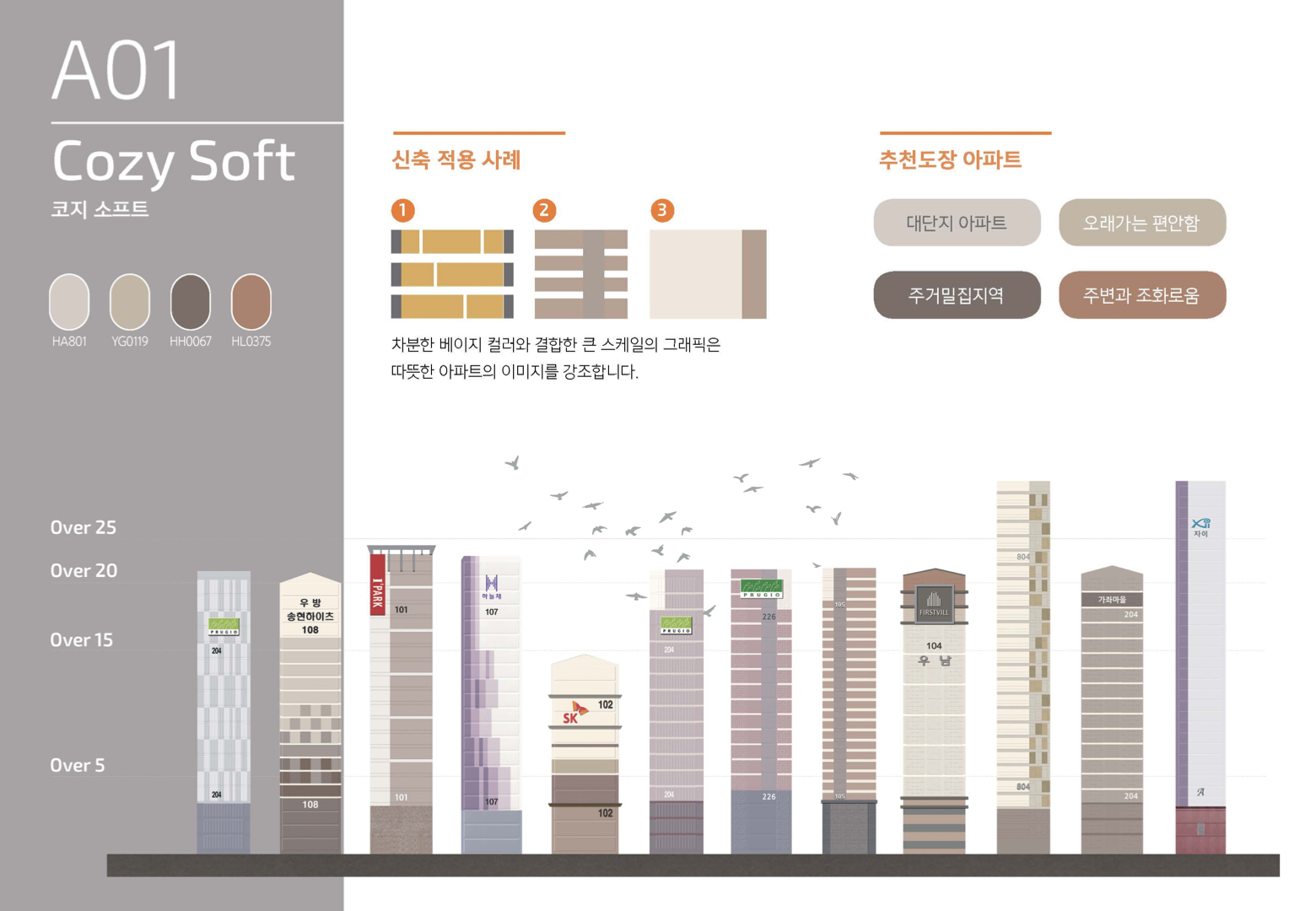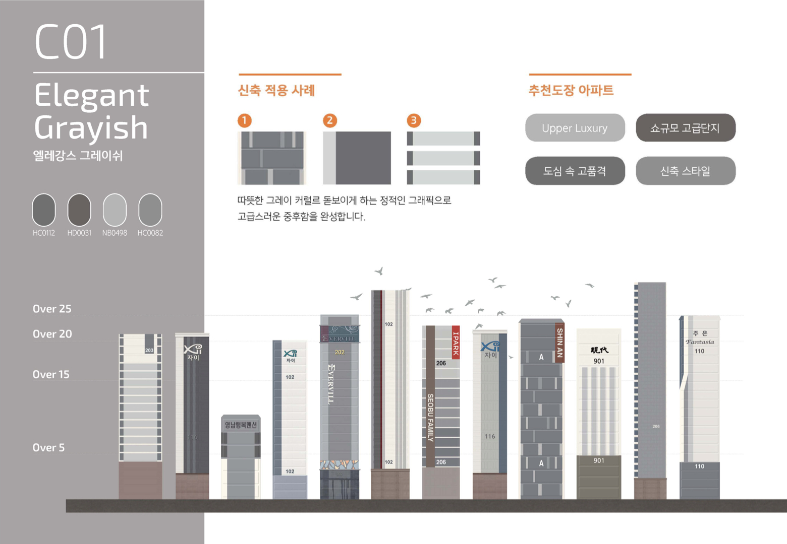 다양한 신축 프리미엄 브랜드 아파트에서 사용되는 중, 저채도의 따뜻한 그레이 컬러는 한층 더 고급스러워진 중후함을 표현한다. KCC는 다년간의 프리미엄 브랜드 색상 설계 노하우를 통해 단지에 가장 적합한 컬러 디자인을 제안한다. 세밀한 분석에 기반한 적재적소의 디자인 계획으로, '컬러로부터 시작되는 프리미엄 주거' 를 완성한다.