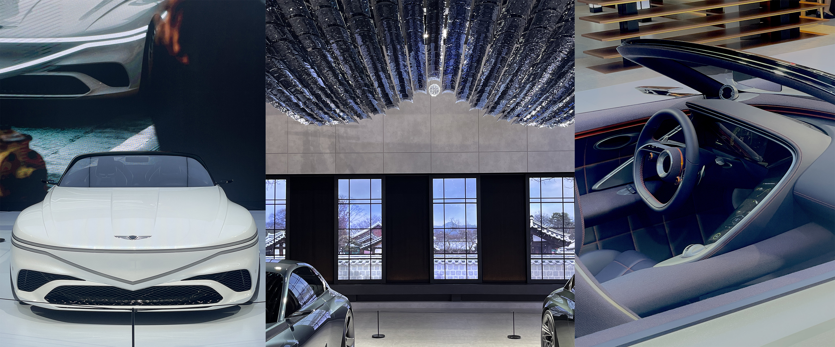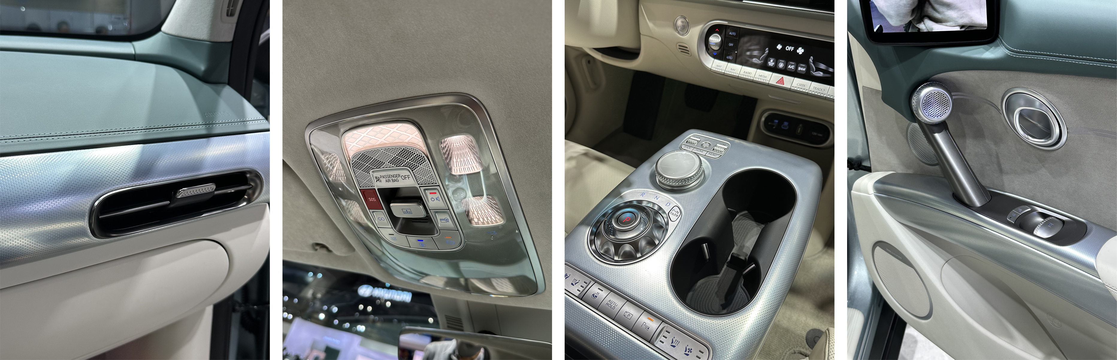 앞 위에 언급했듯 현대 또한 화려한 CMF 디자인을 선보였다. 제네시스 X 컨버터블 네모 퀼팅 모양의 묘한 보랏빛을 띠는 기와 남색 외에도 GV 60는 럭셔리한 내장의 소재들, 특히 perforated steel 패턴 느낌을 전반적으로 사용했으며, 천장에 크리스탈 램프의 디테일이 돋보였다.