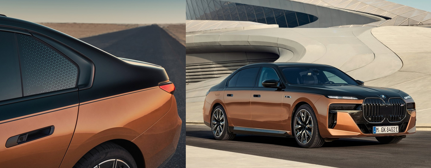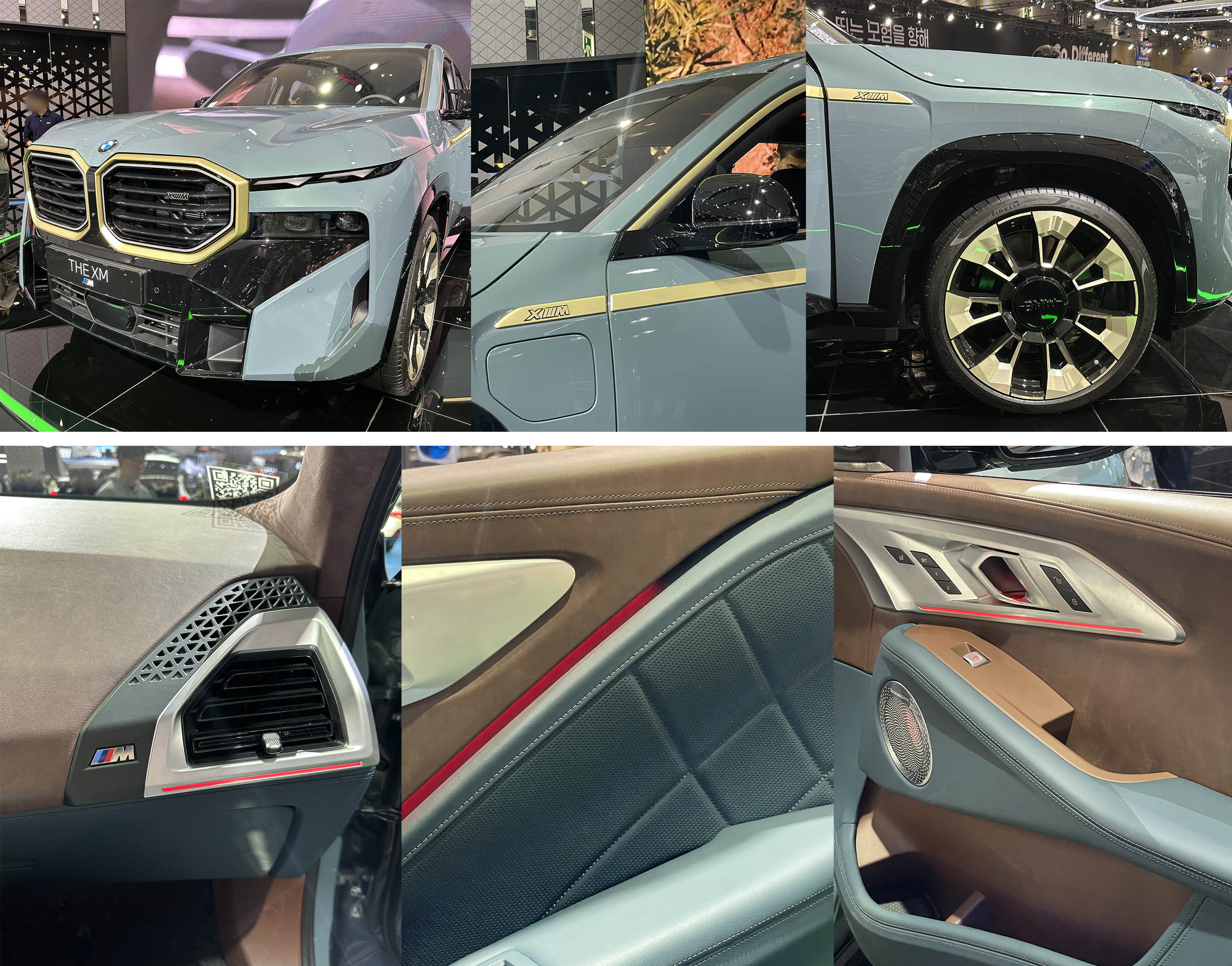 또한 i7 내장 도어 패널에 BMW가 활용 잘하기로 소문난 크리스탈을 활용해 차별된 방향을 제시했으며, 익스테리어에는 시그니처 블루 컬러와 실버로, 럭셔리의 대명사인 투톤 페인트를 선보였다. 또한 과감한 xm의 골드 크로마 엑센트 외장 & 휠 가니쉬, 고급스러운 투톤 인테리어 컬러와 이를 돋보이게 해주는 빈티지 메리노/나파 가죽 소재, 그리고 LED 일루미네이션과 3D 프리즘 구조의 알칸타라 헤드라이너는 BMW의 실험적인 럭셔리 CMF를 증명해 주었다.