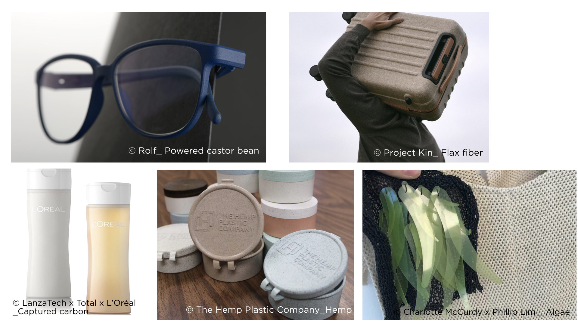 아마와 대마 섬유, 피마자 가루 등 과거 생각하지 못했던 원료가 안경과 여행용 가방 등으로 생산되고 있으며