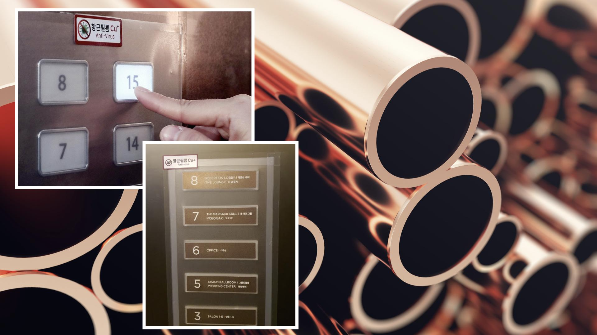 사람들의 접촉이 잦은 엘레베이터 터치 면에서 쉽게 볼 수 있는 구리 항균필름은 항균 마감재 개발의 시작이되고 있다.