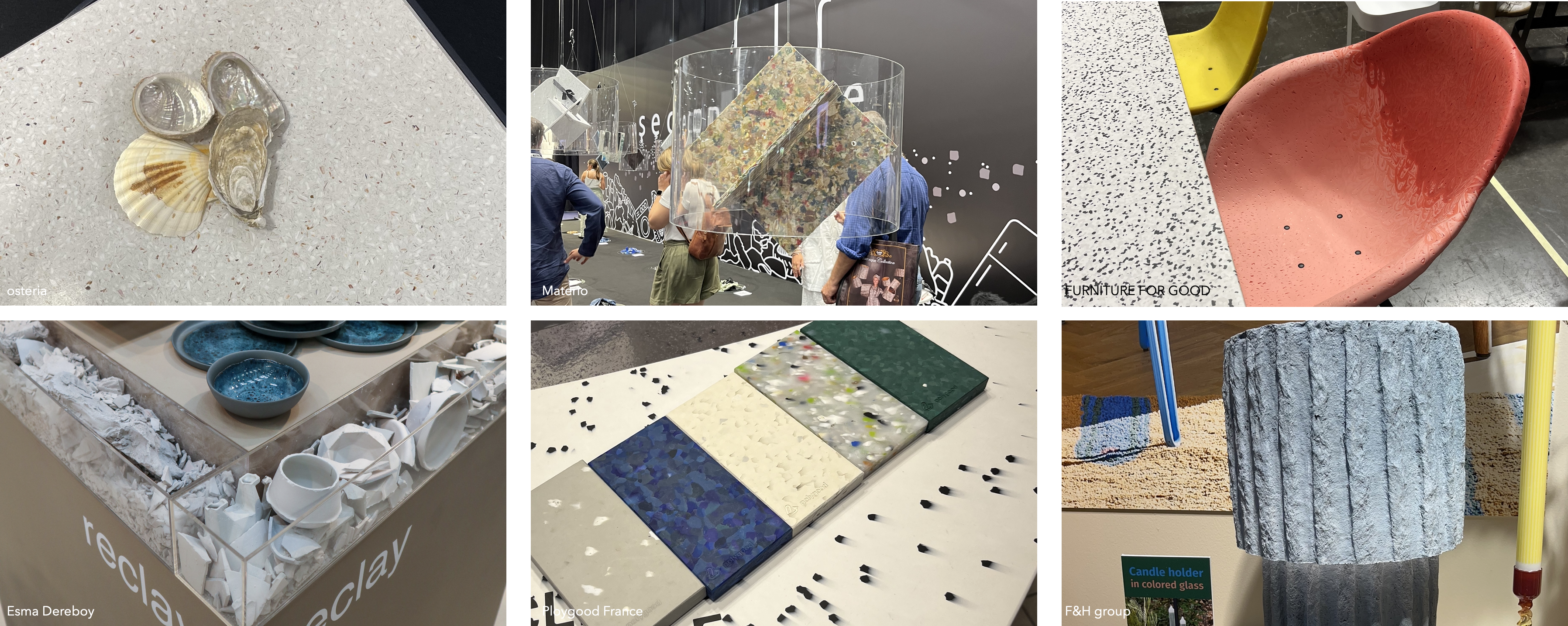 세라믹, 플라스틱 및 쉘 폐기물등의 재활용으로 새로운 복합재 및 표면 패턴이 드러난다. 특히 소재에 쓰인 폐기물들은 그 유래를 함께 강조하며, 다양한 소재들이 잘게 쪼개지고, 섞이고, 다시 붙는 과정이 소재 자체에서 나타나며 과거와 현재를 아우르게 된다.